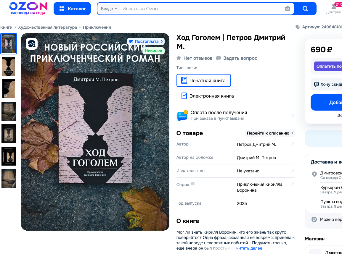 Вы спрашивали, друзья, вы просили, вы торопили — и это случилось! Мой приключенческий роман «Ход Гоголем» доступен для заказа на Озоне! Конечно, всё это нужно было организовать ещё летом, когда книга только вышла. Но… обстоятельства. Во-первых, Озон — это очень сложно. Вы бы знали, сколько там терминов, аббревиатур, нюансов и неочевидных вещей. Организовать продажи своего товара оказалось очень непросто. Но я справился. Во-вторых, я всё же не коммерсант, а писатель. Поэтому тратить на организацию продаж то время, которое можно потратить на творчество, было безумно жалко. Но таков уж путь, который я сам выбрал. Так или иначе, теперь у вас есть возможность купить книгу не через меня, а привычным и удобным способом — через маркетплейс. Никаких сложностей с почтой, согласованием, доставкой и, самое главное, оплатой. Да-да, я знаю, что многих останавливала от покупки необходимость перевести деньги лично мне. Как будто я их украду, как будто ваши 390 рублей (старая цена) стоят накопленно