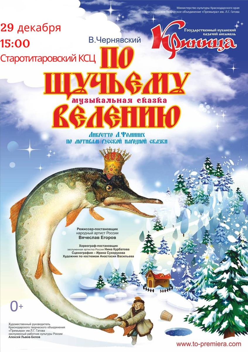 https://www.to-premiera.com/events/po-shhuchemu-veleniyu-gastroli-v-st-starotitarovskuyu/ В одной деревне жил-был старик. У него было три сына: двое умных, третий – дурачок Емеля. Старшие братья работают, а Емеля целый день на печке лежит и ничего не делает. И вот однажды послали его за водой… Обо всех приключениях Емели вы узнаете, посмотрев спектакль «По щучьему велению». Спектакль яркий, красочный, а всех персонажей в сказке: офицеров, царя, царицу, Емелю, его братьев исполняют артисты Государственного кубанского казачьего ансамбля «Криница». Этот спектакль – настоящий подарок для детей и их родителей.