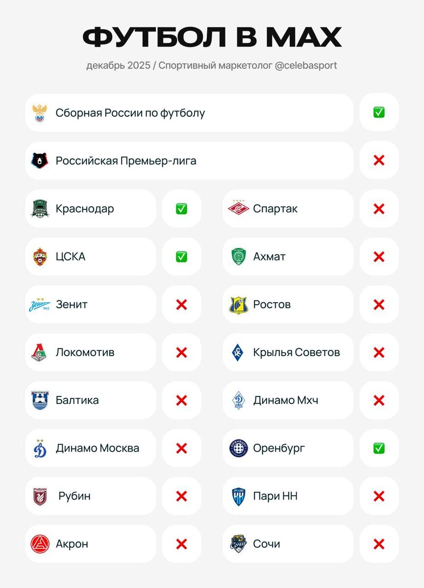 ✍️ Добровольно-принудительно российские пользователи переходят в MAX. Мы зарегались в отечественном мессенджере, чтобы посмотреть, кто из субъектов спорта уже там. Футбол. Официальные каналы в MAX завели пока три клуба РПЛ («Оренбург» это сделал сегодня). У самой РПЛ канала в MAX нет. ПРО маркетинг в спорте