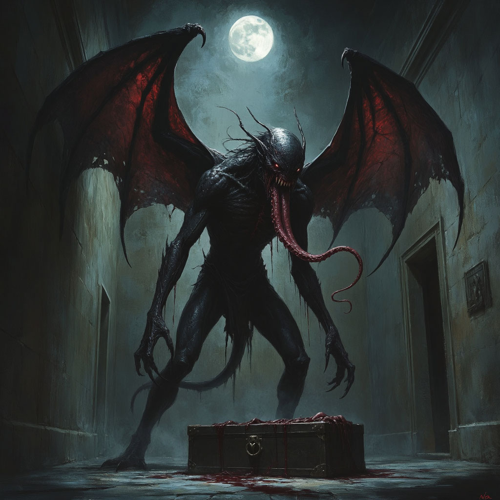 Это была верхняя половина Элиаса, преображенная в кошмар. Руки превратились в кожистые, костлявые крылья, как у гигантской летучей мыши. Из отрубленной талии свисали длинные, блестящие, розовато-серые кишечники, извивающиеся как змеи. Лицо было искажено голодной злобой, рот растянут в неестественной улыбке, а из него вытягивался тот самый хоботок — длинный, тонкий, заостренный на конце, сверкающий слюной. Существо парило в воздухе, отбрасывая чудовищно огромную тень.
