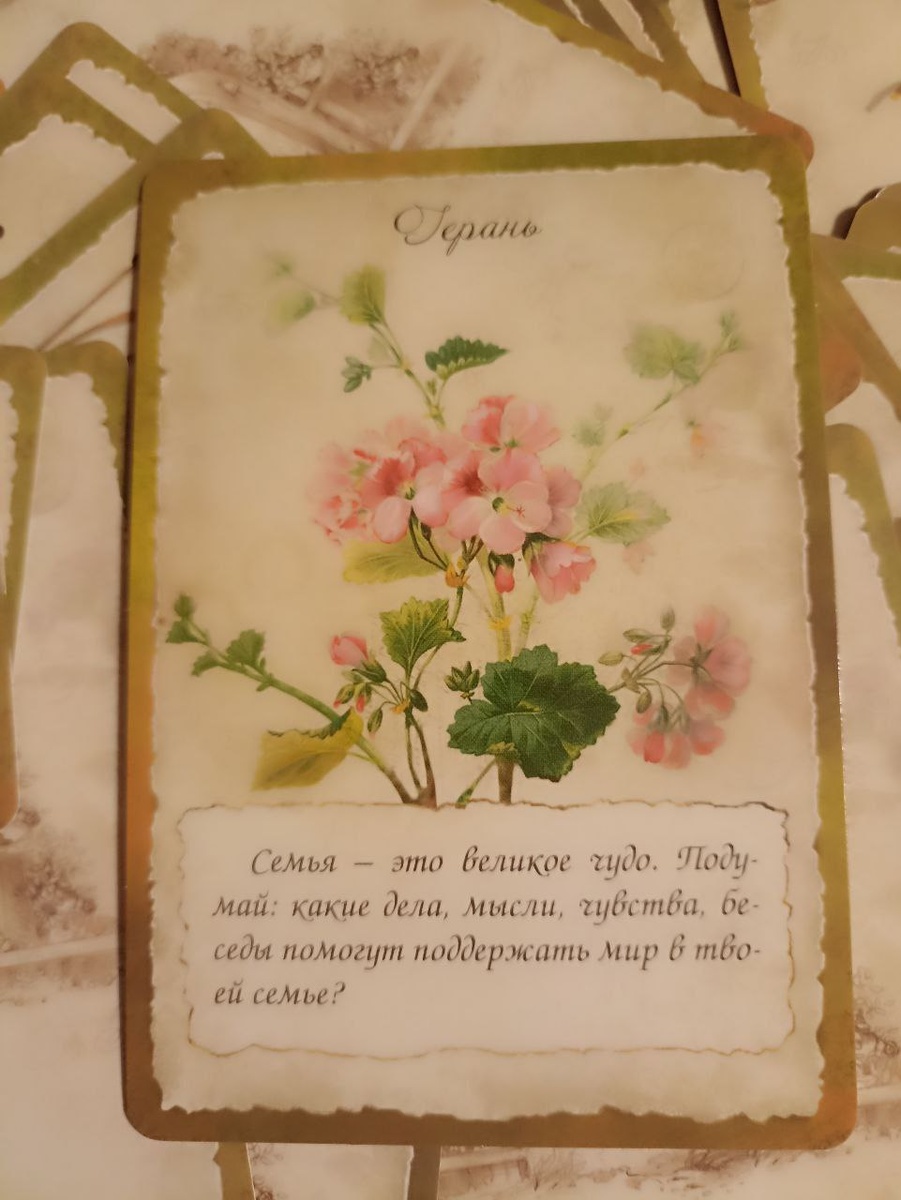 На этой неделе мы предлагаем вам вместе поразмышлять с помощью метафорической колоды "Хранительница сада" над важными и красивыми вопросами, уделяя особое внимание энергии каждого дня. Понедельник - 8 декабря. "Герань". Как вы, возможно, помните, символизирует энергию и аромат счастливой женщины. Герань как растение считается хранительницей семейного очага и помощницей в гармонизации семейных отношений. Также она способствует выбору именно своего партнёра и укреплению любви внутри семьи. Постарайтесь оставить последнюю карту, чтобы почувствовать отклик на неё. Обратите внимание, есть ли в вашем ощущении связь с этим образом. Можно окурить пространство геранью и задать себе вопросы, связанные с внутренней гармонией: Что важно гармонизировать в моей внутренней семье? Какие отношения требуют моего внимания и заботы? Какие качества я хочу развивать в себе, чтобы стать более гармоничной и счастливой? Это прекрасная практика для внутреннего диалога и укрепления связи с собой.
