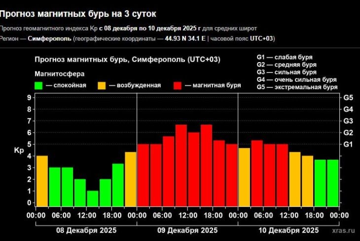 Магнитная буря будет все завтрашние сутки мучать метеозависимых людей. Как рассказали специалисты лаборатории солнечной астрономии ИКИ и ИСЗФ РАН, геомагнитные возмущения начнутся в ночь на 9 декабря и продлятся целые сутки. Космическая непогода обрушится на нашу планету с разной степенью интенсивности ровно в полночь. Буря поднимется почти до уровня G3. Геомагнитная обстановка немного стабилизируется лишь к 12 часам дня 10 декабря. ЧИТАЙТЕ ТАКЖЕ: В Крыму могут участиться пыльные бури В это время особо чувствительные к геомагнитным возмущениям люди могут испытывать апатию, тревогу. Буря может вызвать мигрени, нервные срывы, головокружение, тошноту и бессонницу. Читайте новости Крыма первыми в нашем Telegram-канале и даже когда не работает мобильный интернет в национальном мессенджере MAX.