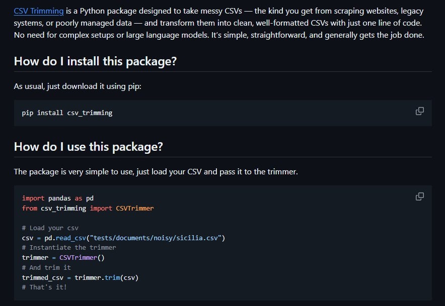 📊 csv_trimming — это Python-пакет, который позволяет быстро очищать CSV-файлы, полученные, например, из веб-скрапинга или старых систем, и