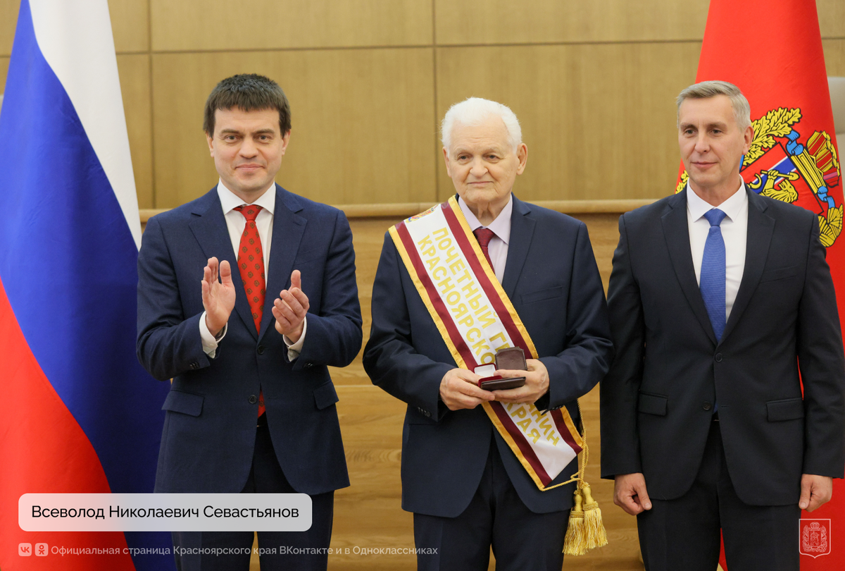 В честь 91-й годовщины со дня образования Красноярского края звания «Почетный гражданин Красноярского края» удостоены Всеволод Севастьянов и Василий Шабанов. Всеволод Николаевич Севастьянов – выдающийся деятель науки, один из основоположников краевого парламента. С его активным участием создавалась современная система управления краем и формировалось законодательство. Академик, научный руководитель Красноярского научного центра СО РАН Василий Филиппович Шабанов – ученый с мировым именем. Его труды известны не только в России, но и за ее пределами. Атрибуты высшей региональной награды им вручили губернатор края Михаил Котюков и председатель Заксобрания края Алексей Додатко. Также глава региона вручи орден «Родительская слава» семье Ошиных из Красноярска. У Иулии и Ивана три дочери и пятеро сыновей. Указ о награждении супругов высшей госнаградой за достойное воспитание детей подписал Президент Владимир Путин.