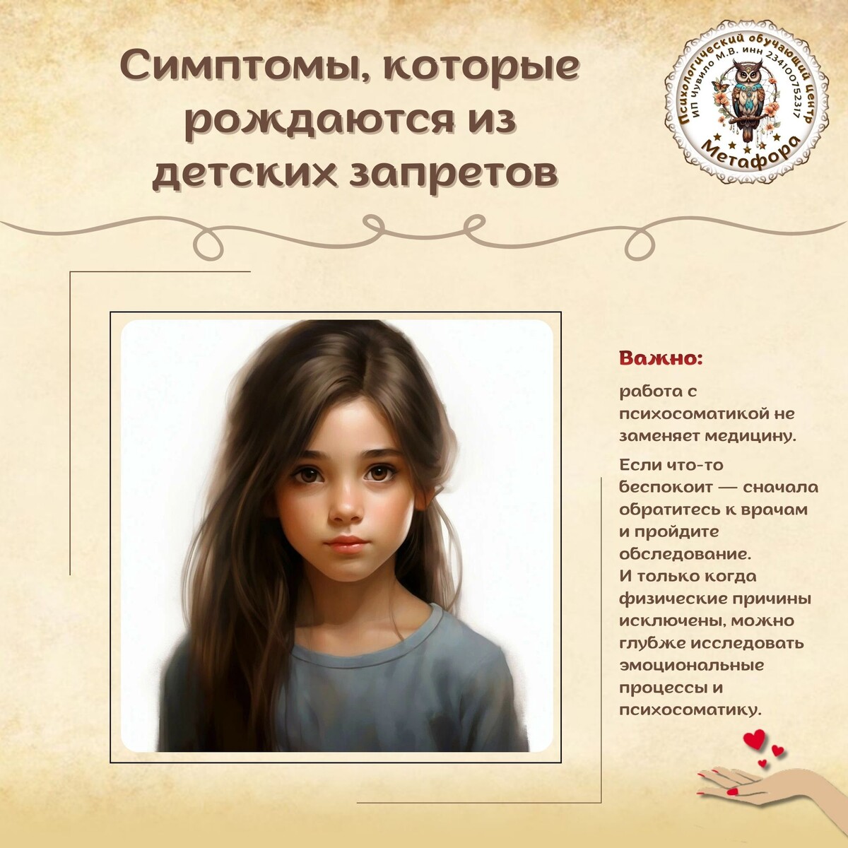 Симптомы, которые рождаются из детских запретов «Не плачь», «терпи», «будь удобным», «не показывай, что боишься»… Знакомые фразы? Большинство из нас слышали их в детстве. И казалось бы — всего лишь слова. Но именно они формируют внутренние правила, которые мы потом носим всю жизнь. Мы учимся держать свои чувства «под контролем», прятать эмоции и соответствовать ожиданиям взрослых. С детства нам говорят: 🦝«Так нельзя...», 🦝«Так нельзя проявляться». И эти запреты откладываются в психике — становятся привычками, которые мы сами себе повторяем: 🍂не показывать гнев, 🍂не проявлять слабость, 🍂 быть «хорошим», даже когда хочется кричать или плакать. Со временем эти запреты проявляются в теле и психике: 🟧Напряжение и зажимы — плечи, шея, челюсть, живот постоянно в тонусе. 🟧Эмоциональные реакции — раздражительность, тревога, страх ошибиться, стыд за свои чувства. 🟧Психосоматические симптомы — боли, головные боли, тяжесть в груди, ком в горле, бессонница. 🟧Внутренняя критика — «ты недо