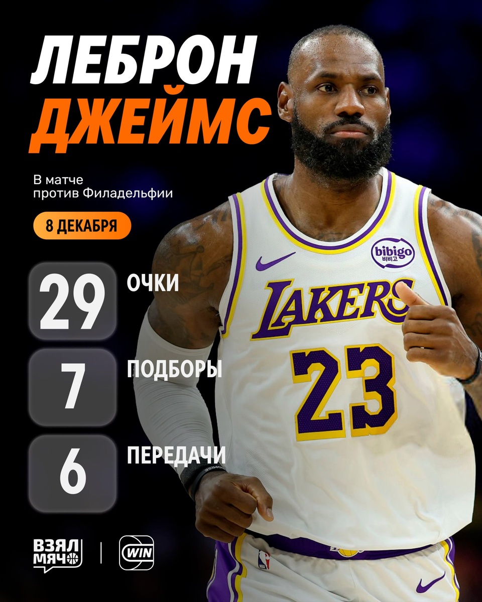 🔥 Леброн Джеймс сделал разницу Звёздный форвард провёл свой лучший матч в сезоне и практически в одиночку вынес «Филадельфию» в клатче, забив 4 из 4 за последние 5 минут. Он набрал 29 очков, реализовав 67% трёхочковых и 71% с игры, 7 подборов, 6 передач, а также 1 перехват и 1 блок за 34 минуты. Готов вырывать тяжёлые победы практически в 41 год. 🏀 ПОДПИШИСЬ — ЗДЕСЬ ЖИВЁТ БАСКЕТБОЛ!