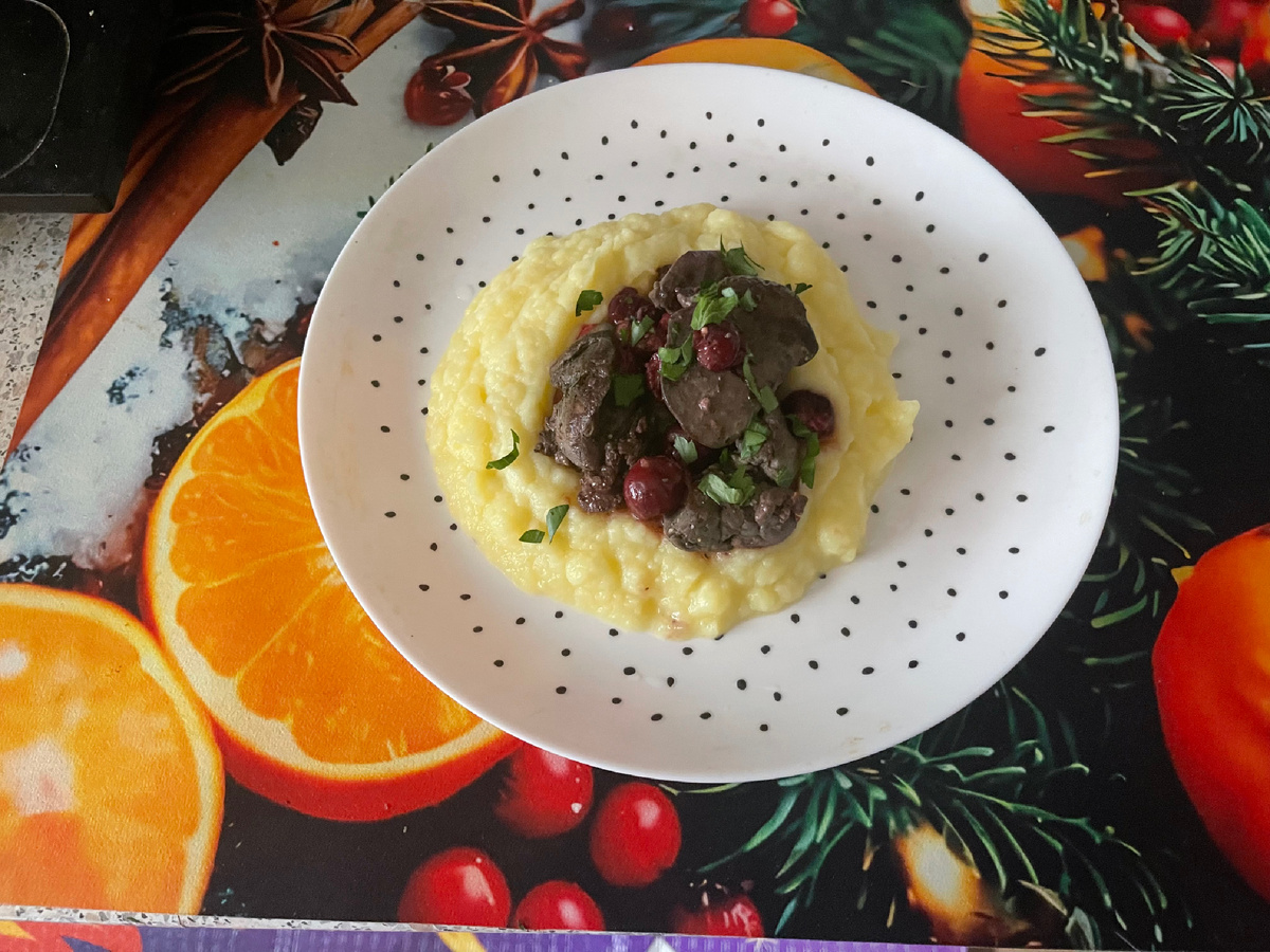 Куриную печенку можно приготовить по разному и всегда это будет вкусно. Сегодня предлагаю печень с вишней. Ингредиенты : Куриная печенка - 500 гр., 1 стакан свежей или мороженой вишни без косточек . растительное масло - 2 ст. Ложки . сушеный тимьян - 1/2 ч.ложки, 1 ч.ложка сахара, черный молотый перец и соль. Приготовление : печень промыть, вырезать все ненужное - сосудистую часть, нарезать на 2 или 3 части и обсушить на бумажных полотенцах . В сковороде разогреть растительное масло,, выложить подготовленную печень и обжаривать около 5 - 7 минут, периодически помешивая. В почти готовую печень добавить соль, сахар, молотый перец, сушеный тимьян и еще обжаривать 1 минуту. Добавить вишню, готовить еще 5 - 7 минут, помешивая. Подаю такую печенку с картофельным пюре, хотя с любым другим соусом тоже будет очень вкусно. Приятного аппетита!