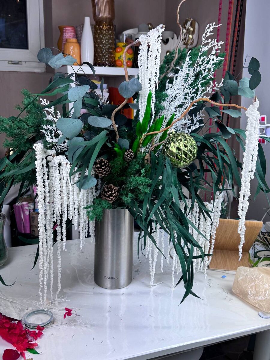 Наконец-то, накрыло и меня новогоднее настроение 🌲 Вчера на одном дыхании сделала универсальную композицию. Здесь и морозные узоры в виде веточек кермека, и сосульки в виде свисающего амаранта, эвкалипт насыщенного цвета, изумрудный дагурус и темно-зеленый аспарагус имитирующий хвою. А универсальна она потому что после нового года можно вынуть шишки и снять шар и готова интерьерная композиция🤗