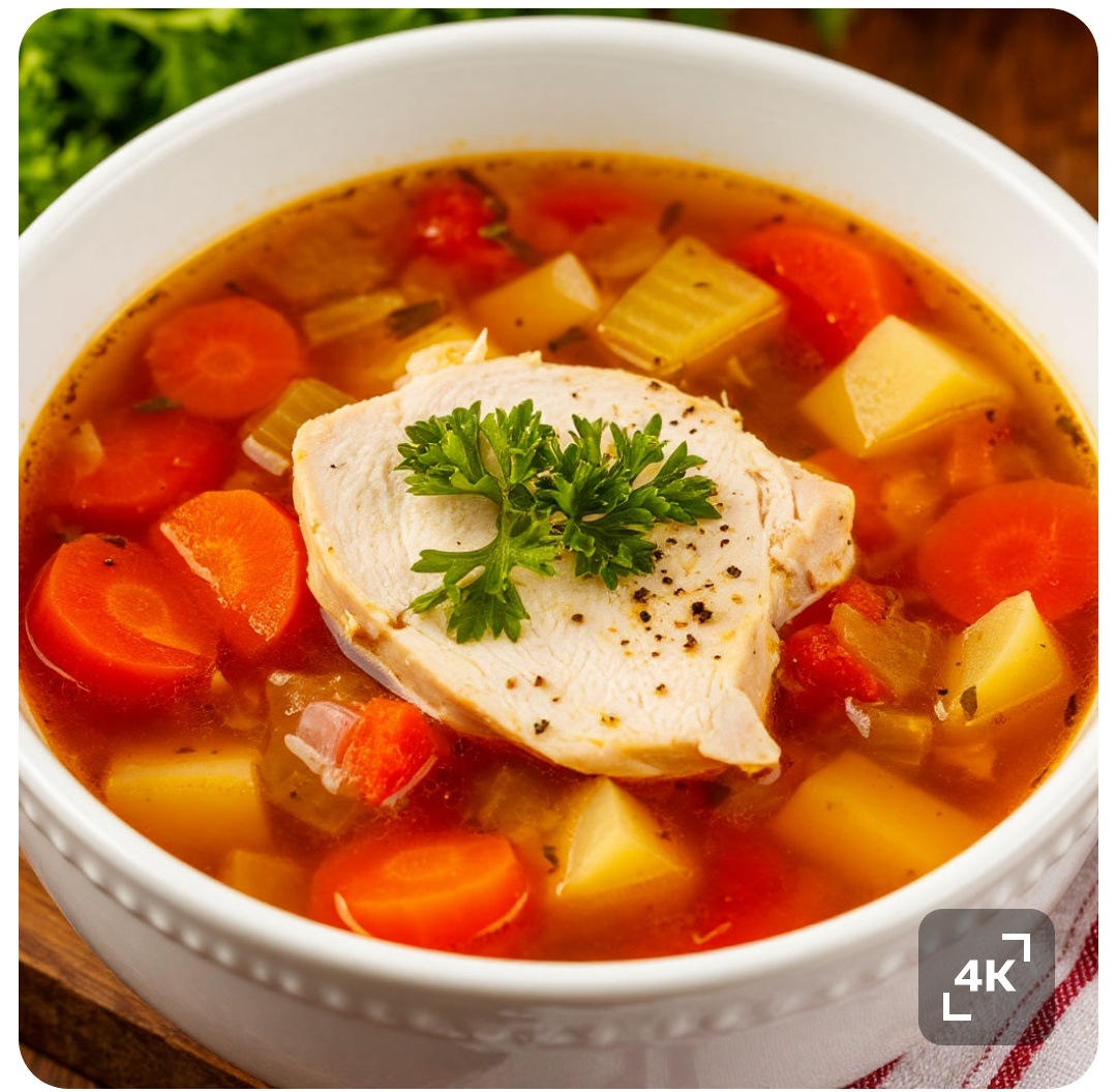 Овощной суп с курицей — это легкое и питательное блюдо, которое идеально подходит для обеда или ужина. Такой суп сочетает в себе нежное мясо курицы и полезные овощи, создавая гармоничный и вкусный результат. В этом рецепте я расскажу, как приготовить овощной суп с курицей шаг за шагом, включая необходимые ингредиенты и способы приготовления. Ингредиенты: - Куриное филе — 300 г - Картофель — 3-4 среднего размера - Морковь — 1 крупная - Лук репчатый — 1 средняя головка - Сладкий перец — 1 штука - Цукини или кабачок — 1 небольшой - Помидор — 2 средних (или 3 столовые ложки томатной пасты) - Чеснок — 2 зубчика - Растительное масло — 2 столовые ложки - Лавровый лист — 1-2 штуки - Соль, черный перец — по вкусу - Свежая зелень (укроп, петрушка) — по желанию - Вода или куриный бульон — 1,5 литра Приготовление: 1. Подготовка курицы Куриную грудку промойте и нарежьте небольшими кусочками или полосками. Можно использовать и куриные бедра без кожи, чтобы суп был боле