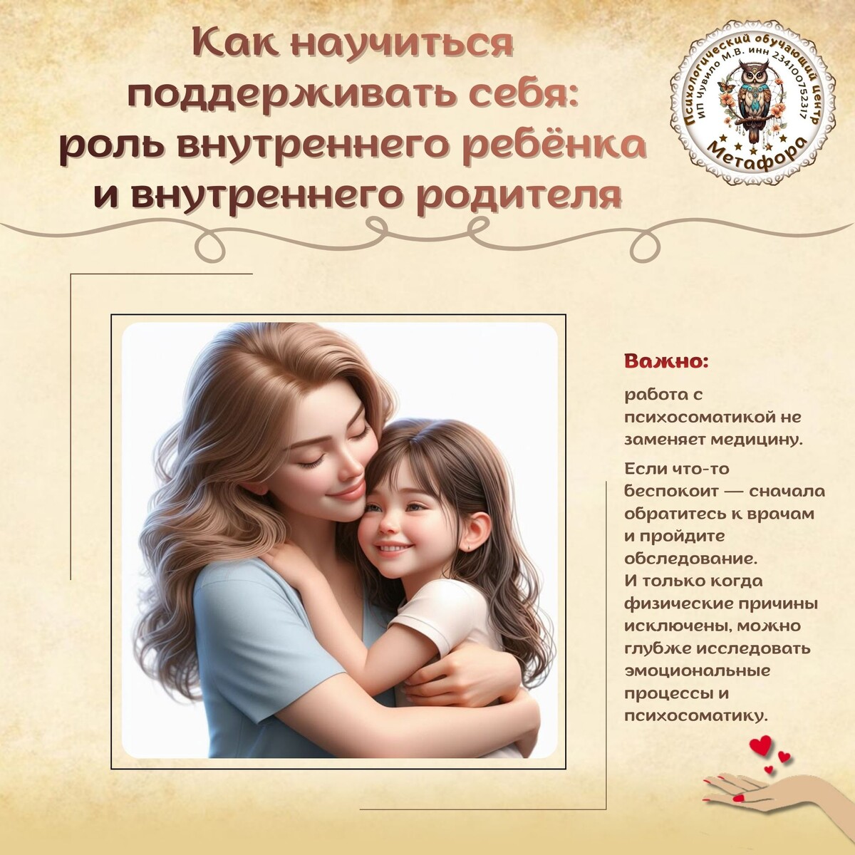 В этой практике ваш внутренний ребёнок встретится с поддерживающим родителем — той частью вас, которая умеет успокаивать, обнимать, понимать и защищать.