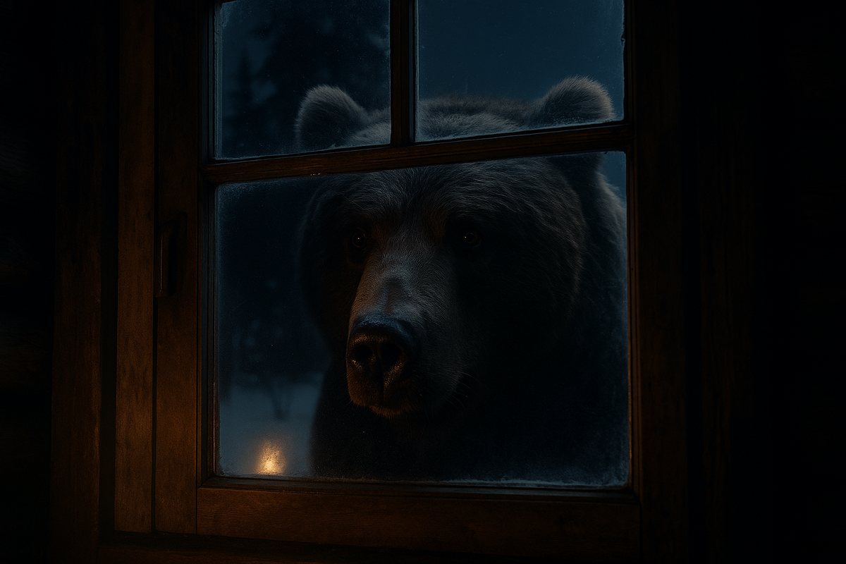 Друзья-охотники, любители тайги и просто те, кто ещё не боится спать в избушке, пристёгивайтесь покрепче! Сейчас будет такая дичь, что вы потом неделю будете проверять окна в 3:33 ночи. ⏰👁️ Место действия 🗺️🌲 Национальный парк «Водлозерский», кордон Коскосалма. До ближайшей деревни 28 км по болоту и бурелому. Сотовая связь только на макушке самой высокой сосны. Октябрь-ноябрь 2025 года, температура ночью от –12 до –27 °C, ветер воет, как стая волков. Главный герой-егерь 🧔🔫 Алексей Круглов, 41 год, 12 сезонов живёт один на кордоне. Борода до пояса, голос как у медведя, характер — сталь. Все его знают как «Лёху, которого ничем не проймёшь». До этой осени. Главный злодей 🐻🖤 Медведь-самец, возраст ≈ 12–14 лет, вес под 380–400 кг в осеннем жиру. Чёрный, как сама ночь, глаза светятся жёлтым в фонаре. Кличка от Лёхи — «Стук» (или «Тот-Самый-Уёбок», когда совсем доставал). Окно-убийца 🪟 Обычное советское окно 60×80 см, одинарное стекло, деревянная рама 1987-го года. Высота подоконн