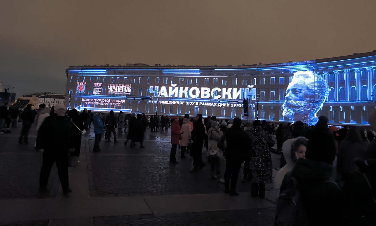 Вчера побывала на Дворцовой площади, где посмотрела невероятное мультимедийное шоу. Народу было довольно много, но видно все отлично. На входе стояли шатры с рамками и проводили досмотр. Бутылку с водой понюхали и пропустили внутрь. В рамках Дней Эрмитажа прошел световой спектакль, посвященный 185-летию со дня рождения Петра Ильича Чайковского. 20-минутный спектакль прямо на здании Главного штаба завораживает. Кроме того, показали работы финалистов конкурса современного медиаискусства "Страна СВЕТА". Сказать по правде, понравились далеко не все. В том году были лучше. Иногда картинки сменялись так быстро, что даже было неприятно на это смотреть. Одна работа прямо совсем ужас-ужас. Словно автор принял чего-то запрещенного. Но, к счастью, большая часть работ были вполне достойными. Особую глубину представлению придадут голоса известных петербургских артистов — Николая Бурова, Олега Куликовича и Анны Геллер. Они озвучат мысли и воспоминания близких и современников Чайков