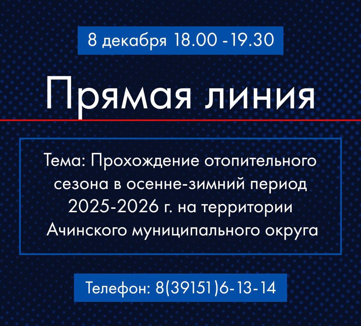 Задать вопрос Главе Ачинского муниципального округа можно до 19.30 ч. по тел. 8(39151)6-13-14.