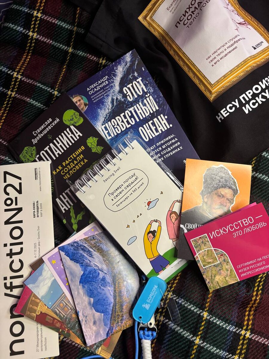 часть покупок с non/fiction 27 🎄 конечно же книжки, вечный календарь, еще подумываю взять отрывной на год. ❤Ботаника антрополога. Как растения создали человека от @bombora - захватывающее расследование, проведённое антропологом, который показывает, что наша судьба на протяжении миллионов лет была неразрывно связана с миром флоры. ❤Этот неизвестный океан: как работают приливы, рождаются шторма и живут невидимые создания в морских глубинах от @bombora - книга дает общее представление об океанологии и входящих в нее направлениях, таких как морская биология, физика и химия моря, морская геология и другие. прочитав, вы узнаете, как проходят научные морские экспедиции, как ученые наблюдают за течениями, составом воды, рельефами дна, контурами побережий, обитателями морей и океанов. ❤Проверь погоду в своем сердце. Вечный календарь - этот календарь-ежедневник создан для того, чтобы у вас была передышка в начале и в конце каждого дня. не обошлось и без подарочков и открыток 🩷