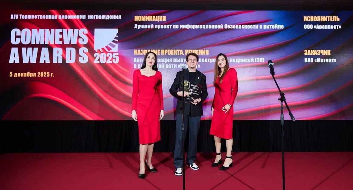 ⚡️ Взяли новую высоту! Друзья, у нас радостная новость! 5 декабря на XIV церемонии ComNews Awards наш проект стал победителем в номинации «Лучший проект по информационной безопасности в ритейле» 🏆 Речь о сотрудничестве с розничной сетью «Магнит», где мы реализовали проект «Автоматизация выпуска электронных подписей» на базе Avanpost PKI, о котором рассказывали недавно в этом посте 🖥 «Мы гордимся, что построили такую систему на федеральном масштабе. В таком объёме и с такой степенью автоматизации наше решение является эксклюзивным на рынке, что подтверждает наше технологическое лидерство в сфере ритейла» – сказал Евгений Галкин, директор по кибербезопасности Avanpost. Спасибо команде «Магнита» за доверие и мощный совместный результат! Двигаемся дальше 🚀 🅰️ Подписаться на Avanpos