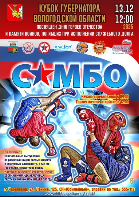 Администрация Череповца сообщила о проведении Кубка губернатора Вологодской области по самбо. Турнир запланирован на 12 и 13 декабря и состоится в спортивном комплексе «Юбилейный». Организаторы ожидают участие спортсменов из муниципалитетов региона и учебных спортивных школ.