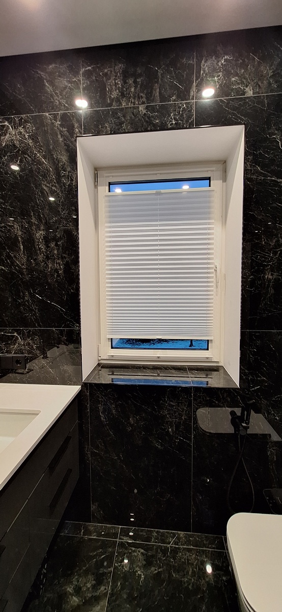 Шторы плиссе — это универсальный вид оконного декора, который идеально подходит для современного интерьера. Благодаря своей конструкции такие шторы выглядят аккуратно, занимают минимум места и обеспечивают комфортное управление светом. На фотографии видно, как шторы плиссе трансформируют пространство ванной комнаты: они гармонично сочетаются с тёмной мраморной плиткой, делая интерьер более уютным и завершённым. Почему шторы плиссе становятся главным трендом для дома? Современные шторы для дома должны быть не только красивыми, но и практичными. Плиссе справляются с этой задачей на все 100%: Экономят место — конструкция устанавливается прямо в оконный проём. Поддерживают стиль — ровные складки создают аккуратный визуальный ритм. Управляют светом — можно выбрать степень затемнения от лёгкой полупрозрачности до полного блэкаута. Подходят в любую комнату — от ванной до гардероба и детской. Шторы плиссе в ванной комнате Фотография демонстрирует идеальный пример — шторы для ванной дол