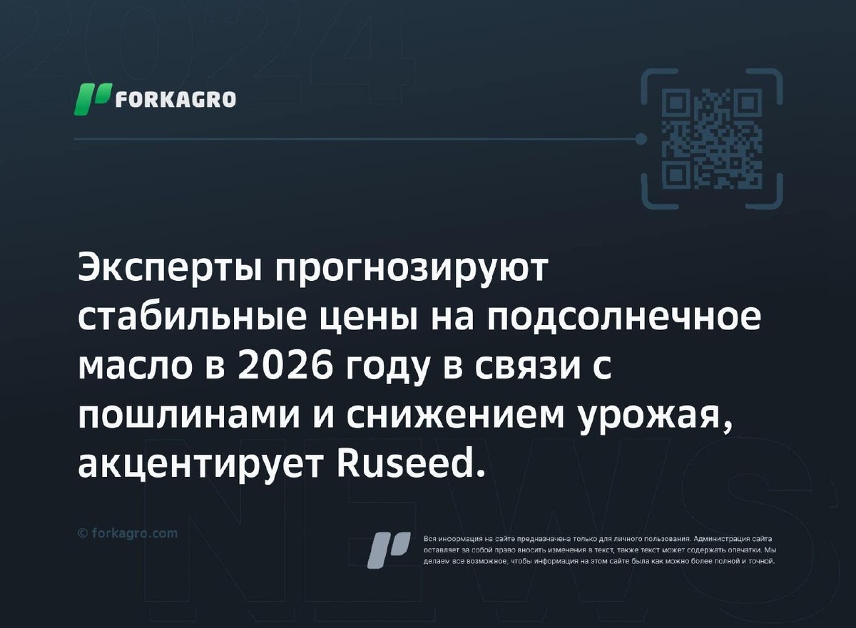 Эксперты прогнозируют стабильные цены на подсолнечное масло в 2026 году в связи с пошлинами и снижением урожая, акцентирует Ruseed. Эксперты ожидают, что экспортная пошлина на подсолнечное масло сохранится на уровне декабрьских значений или вырастет. Снижение урожая удерживает цены, их дальнейшее изменение зависит от мировых цен, курса рубля и урожая 2026 года. Производство масла снижается, цены растут из-за дефицита сырья. Повышение пошлины замедляет экспорт. Покупатели из Ирана, Индии и Турции скоро могут вернуться к закупкам. Объемы экспорта масел из России снизились на 21% в этом году, в основном из-за уменьшения экспорта подсолнечного масла. Перейти к источнику