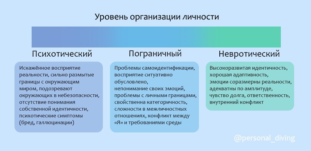 Что такое невротический, пограничный и психотический уровни организации личности? Эти термины не являются диагнозами; они отражают то, на сколько человек адаптивен к реальности. Невротические личности хорошо функционируют и адаптируются, адекватно воспринимают реальность. Способны выстраивать достаточно крепкие и стабильные межличностные отношения. Невротики, как правило, хорошо осознают себя: кто они, про что они, что им нравится, а что нет, чего хотят или не хотят. У пограничной личности ощущение собственного «Я» наполнено противоречиями. Пограничникам сложно сохранять целостное представление как о себе, так и о других. Они склонны испытывать сильные амбивалентные эмоции, иметь проблемы с границами, своими и чужими. Демонстрируют импульсивное поведение. Могут часто менять хобби или работу, быстро терять интерес и мотивацию. Искажают реальность в своём восприятии. Психотическая личность опустошена и дезорганизована. У психотической личности присутствует глубокий экзистенциальный стра