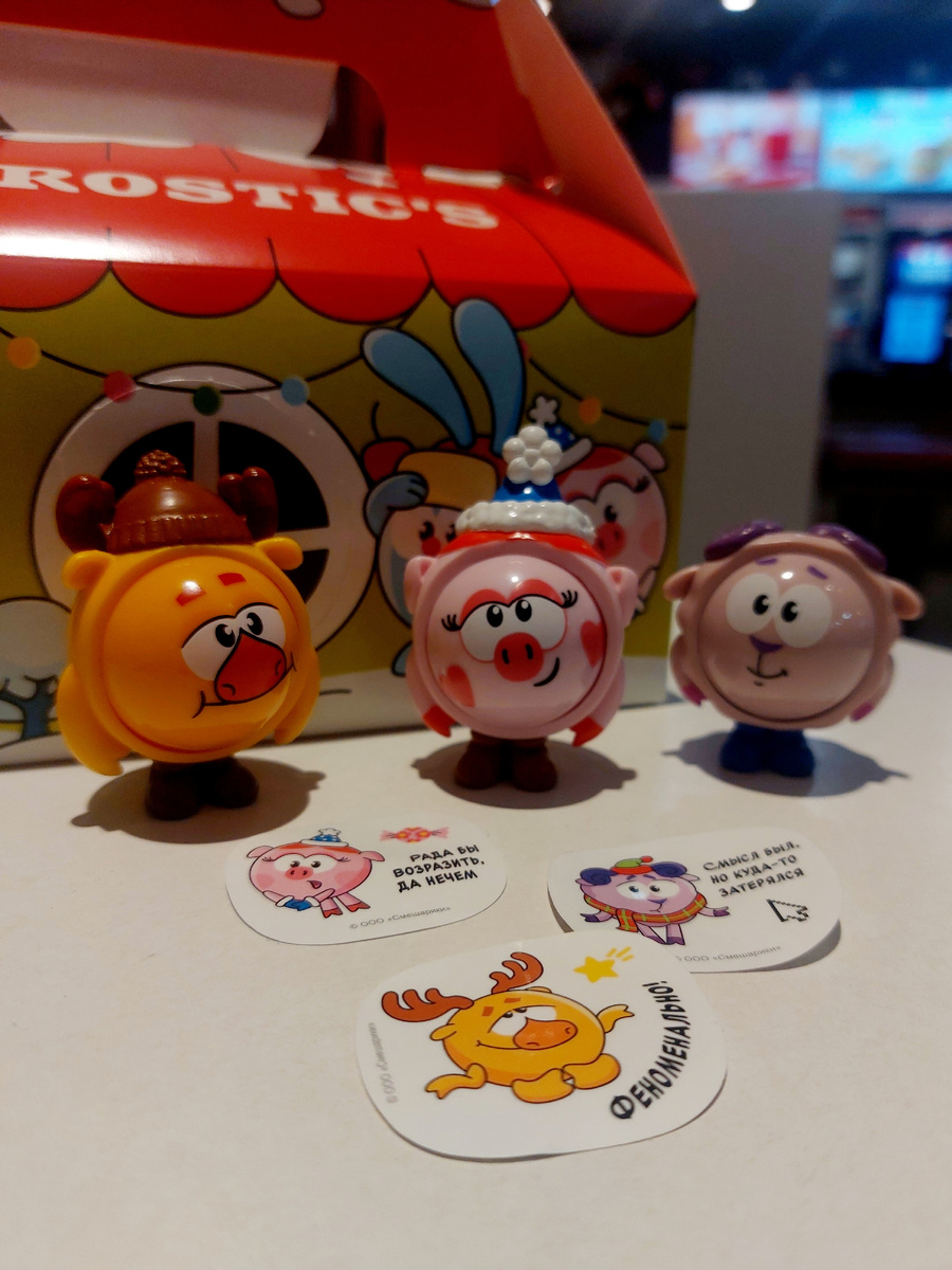 на свиданием с Крашем и Крошем. В комбо входит продукция Ростикс на выбор и одна игрушка Смешарик. Можете испытать удачу, а можете сразу попросить на кассе определённого Смешарика. Если заказываете комбо через доставку, также можно