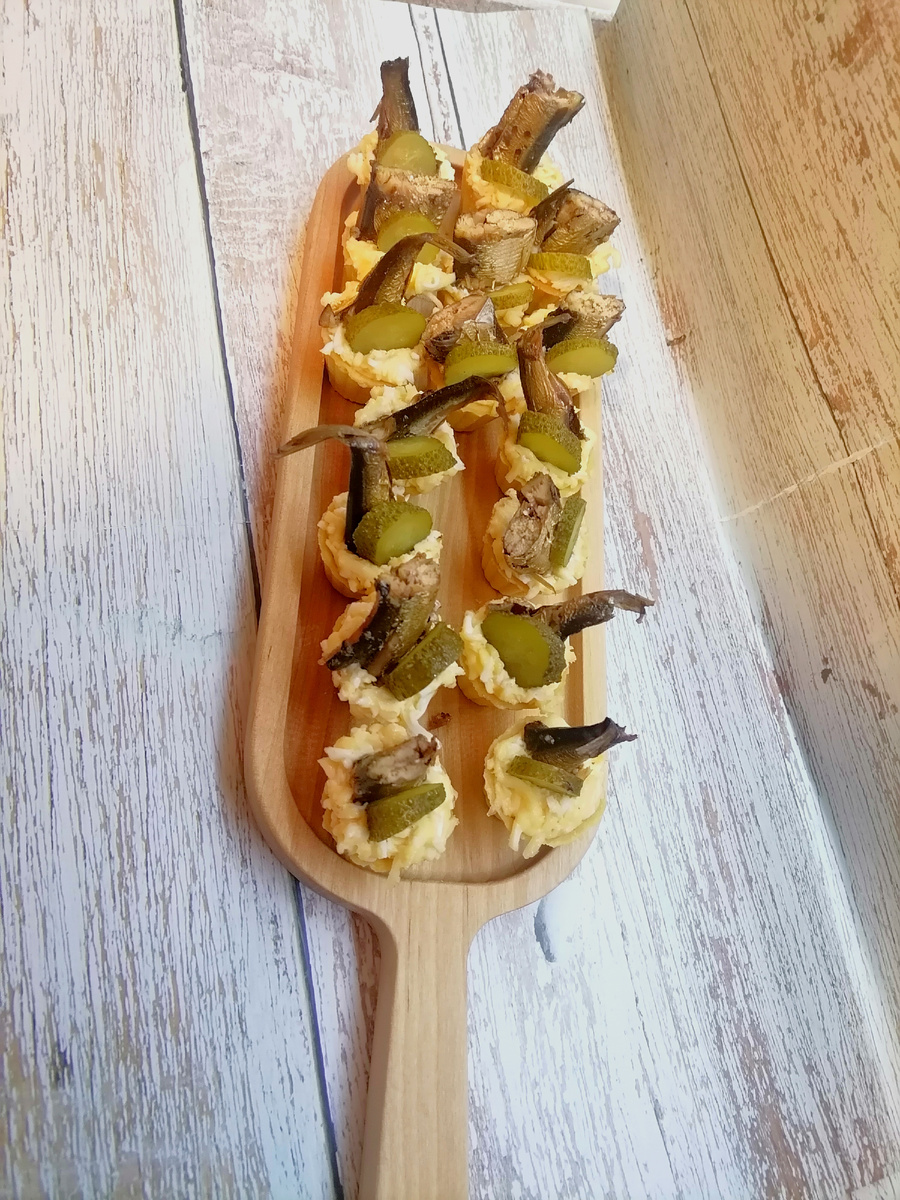 Отличная закуска к новогоднему столу. " Тарталетки фееричные". Ингредиенты: - сыр 100 гр, - 2 яйца, - тарталетки, - баночка шпрот, - огурцы маринованные, - майонез. Способ приготовления: На тёрке трём : сыр и яйца, добавляем майонез, перемешиваем. Данную смесь расскладываем по тарталеткам и аккуратно кладём кружочек огурчика и 1 шпроту, если шпрота большая можно разрезать на несколько частей, как я собственно и сделала. Это очень вкусно и необычно. Всем приятного аппетита! #закускинастол#праздничныезакуски#тарталетки#закускасошпротами#закускатарталетки#