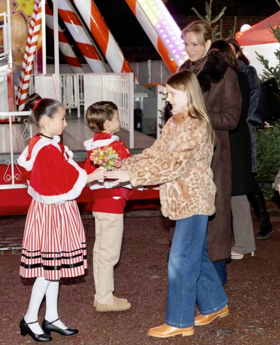 Да, накануне семья Альбера Второго открывала рождественскую деревню в Монте-Карло. Приветствовала горожан и детей в национальных костюмах. А мы о костюмах жены правителя, Шарлен, и ее дочери Габриэль. Девочке, как и ее брату-близнецу, послезавтра исполнится 11. На мой взгляд, при всех недостатках Гримальди, у Альбера не отнять внимание к продолжению рода: растут красивые дети( про незаконнорожденных умолчим). Маленькая модница одета мамой чаще всего в Dior. Но этим вечером на Габриэль мы видим сапожки и курточку от Chloe. Мама, принцесса Шарлен, очень внимательна к нарядам принцессы и сына-наследника. Сама Шарлен надела дубленку! И это очень модный тренд сезона! Дубленка из Парижа, от бренда Nour Hammour . YSL шелковый платок с классическим узором пейсли. И очень интересные японские серьги с бриллиантами и жемчугом Акойя от Tasaki. А днем ранее дворец опубликовал праздничное рождественское фото семьи правителя княжества. Мы с вами его мельком посмотрели. На Шарлен