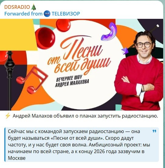 ⚡️ Андрей Малахов объявил о планах запустить радиостанцию - передаёт TG TELEВИЗОР Логично, идея давно просится, учитывая, что программы Малахова стабильно неделя за неделей в общероссийском ТОП-10 Не верится, если это Гуцмедиа решили "чпокнуть" один из своих недопродуктов. ЕМГ, наверное, гордость бы не позволила, а ГПМР ума бы не хватило. Новый конкурент взрослым станциям шансонно-эстрадного формата. Если обойдутся без нескладных стишков Гуца и ворованных ноток его соратника - может даже очень народное радио получится. Возможно, кто-то из малых вещателей решился. Они сейчас - самые смелые и подвижные. Главное, чтоб ВГТРК под этот продукт "Радио Культура" не грохнула. :D В общем, отличное продолжение тренда на появление новых форматов в умирающем FM-диапазоне. Сейчас мы с командой запускаем радиостанцию — она будет называться «Песни от всей души». Скоро дадут частоту, и у нас будет своя волна. Амбициозный проект: мы начинаем по всей стране, а к концу 2026 года зазвучим в Москве - з