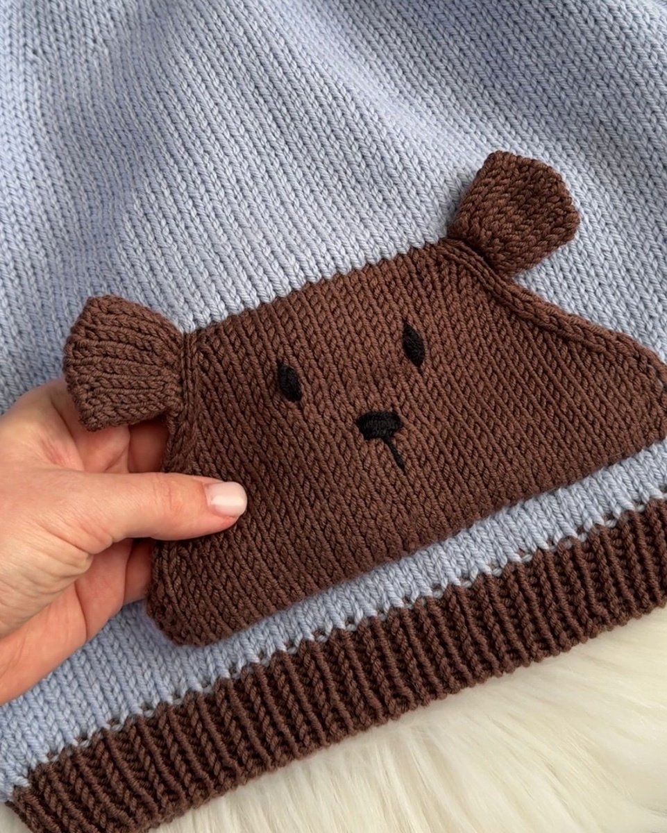Особенно мило смотрятся вещи с трёхмерными элементами — например, свитер или джемпер, на котором из кармашка выглядывает маленький объёмный медвежонок.