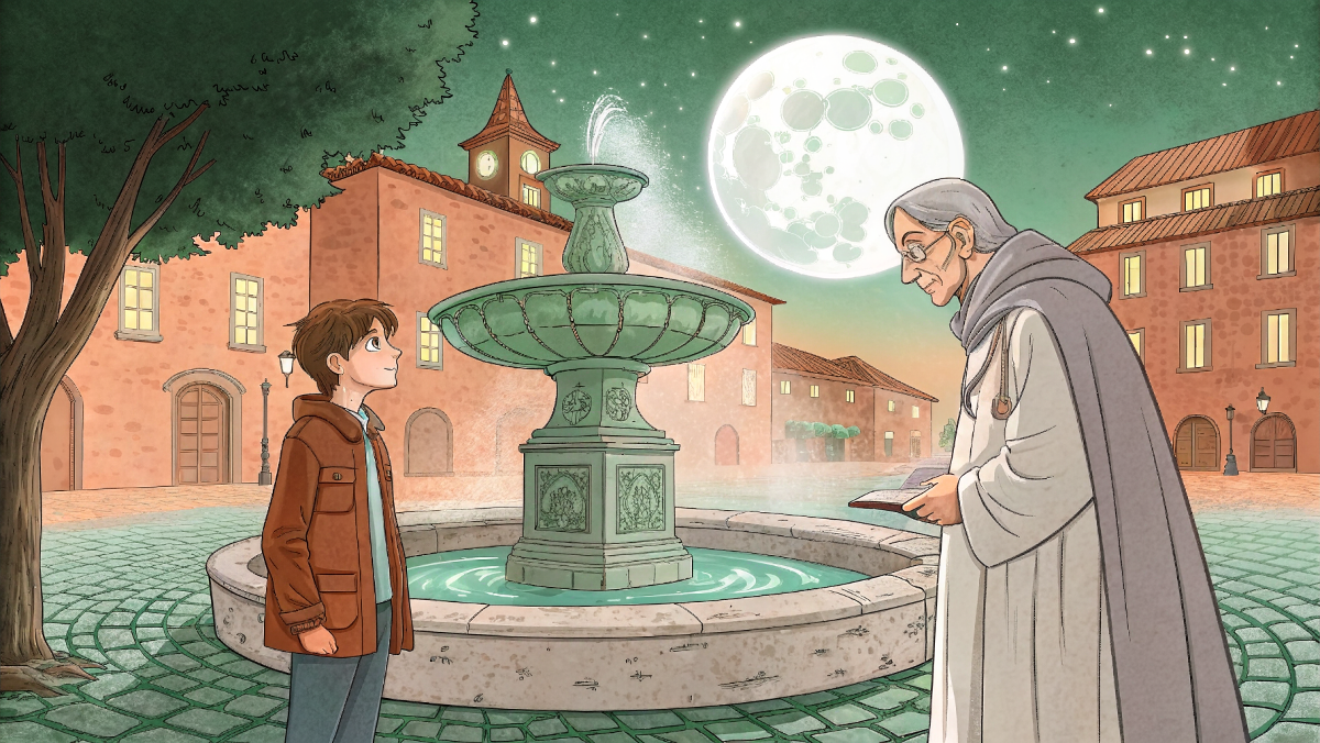На лавке у старого фонтана сидел человек в длинном плаще из серого бархата. Пальцы его были тонкие, как ветви, а глаза как два маленьких окна, в которых горел тёплый свет. Он смотрел прямо на Элиана.