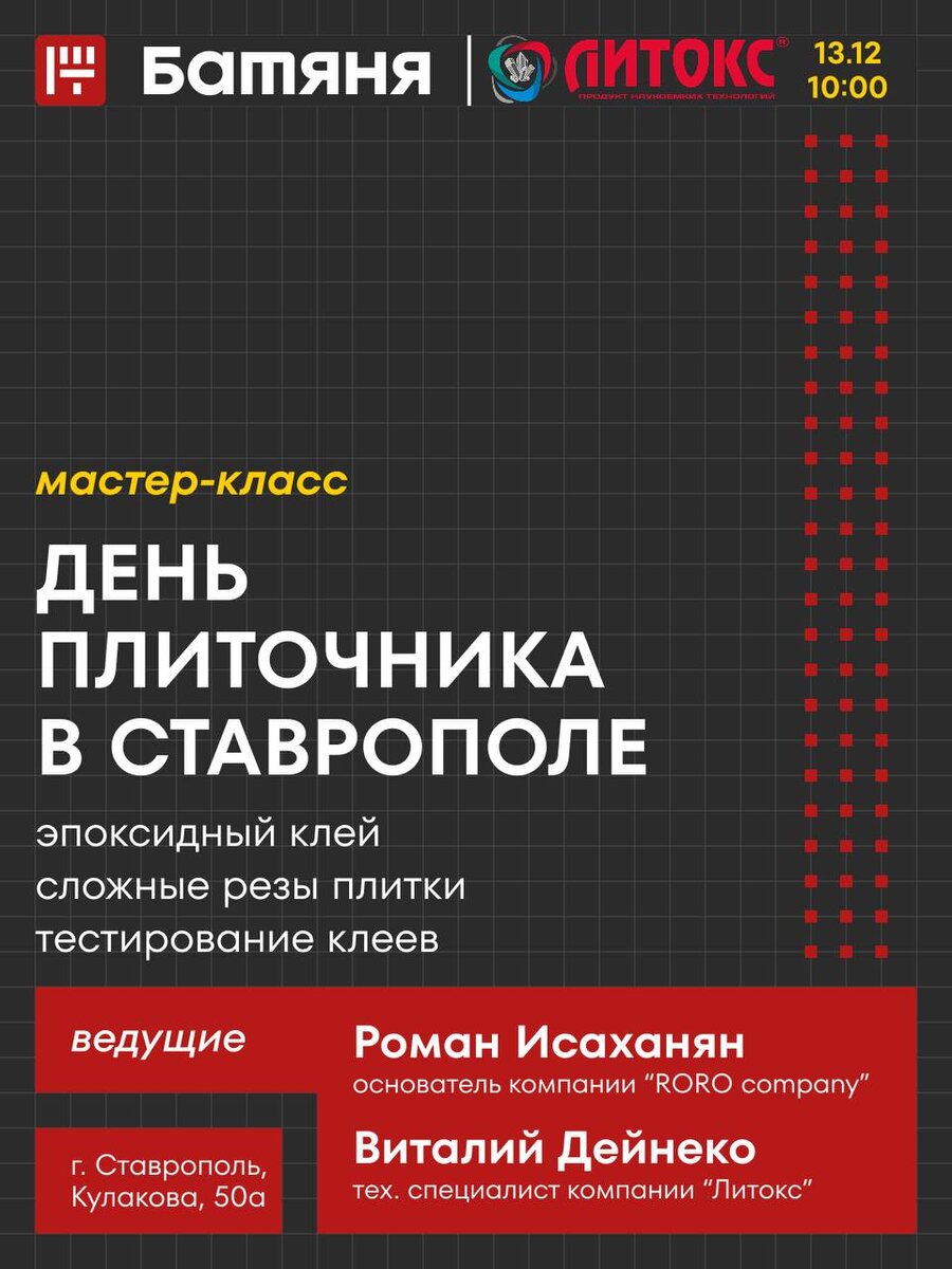 УЖЕ В ЭТУ СУББОТУ — ДЕНЬ ПЛИТОЧНИКА В БАТЯНЕ 13 декабря в 10:00 в профицентре Батяня (Кулакова, 50а) состоится масштабный мастер-класс от компании Литокс и мастера плиточных работ Романа Исаханяна — практические приёмы, разбор ошибок, лайфхаки и демонстрация профессиональных техник. Важно: предварительная регистрация обязательна, количество мест ограничено. РЕГИСТРИРУЙСЯ ЗДЕСЬ