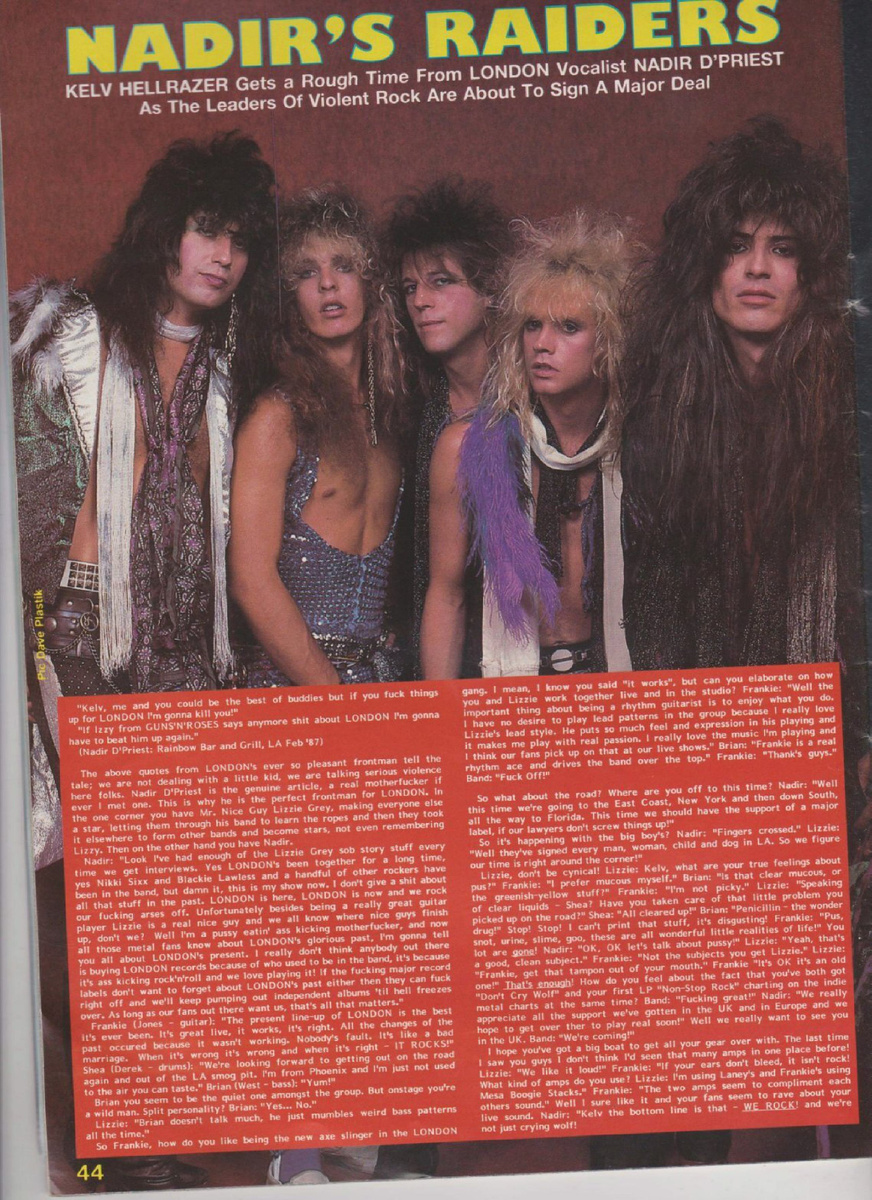 Надир: «Слушай, мне надоели эти душещипательные истории про Лиззи Грея, которые мы рассказываем каждый раз, когда даем интервью. Да, LONDON уже давно вместе, да, Никки Сикс, Блэки Лоулесс и еще несколько рокеров были в группе, но, черт возьми, теперь это мое шоу. Мне плевать на все это прошлое. LONDON здесь, LONDON сейчас, и мы отрываемся по полной. К сожалению, помимо того, что он действительно классный гитарист, Лиззи еще и отличный парень, а мы все знаем, чем заканчивают хорошие парни, не так ли? Я же тупой, надирающий задницы ублюдок, и теперь, когда все фанаты метала знают о славном прошлом LONDON, я расскажу вам все о настоящем LONDON. Я правда не думаю, что кто-то покупает пластинки LONDON из-за тех, кто играл в группе раньше, а потому что это жопонадирательный рок-н-ролл, и мы обожаем его играть! Если эти гребаные мажорные лейблы тоже не хотят забывать о прошлом LONDON, то пусть катятся к черту, а мы будем выпускать независимые альбомы, пока ад не замерзнет. Главное, чтобы наши фанаты нас слушали, это главное».