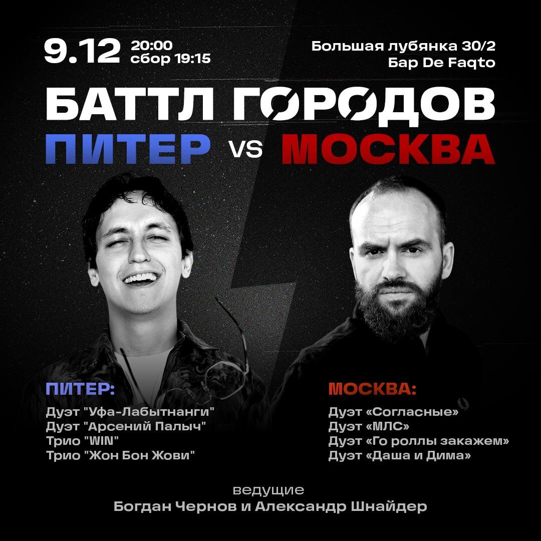 Баттл городов: Питер ⚡️ Москва Соревнование лучших дуэтов, которые прошли отбор в рамках проекта «Битва миниатюр». За этот год мы провели отчётные вечеринки в Петербурге и Москве, увидели десятки выступлений и выбрали самые сильные команды Теперь лучшие из лучших встретятся в одном большом «Баттле городов», чтобы выяснить, чей юмор окажется мощнее — питерский или московский Приходите поддержать команды! 📲 Вход на мероприятие по предварительной записи Telegram: @Vlada_964 WhatsApp: 89647733753 в сообщении укажите: * ФИО * номер телефона * количество мест 9 декабря в 20:00 (сбор гостей с 19:15) Место: Москва, Большая лубянка 30/2, Бар De Faqto 18+
