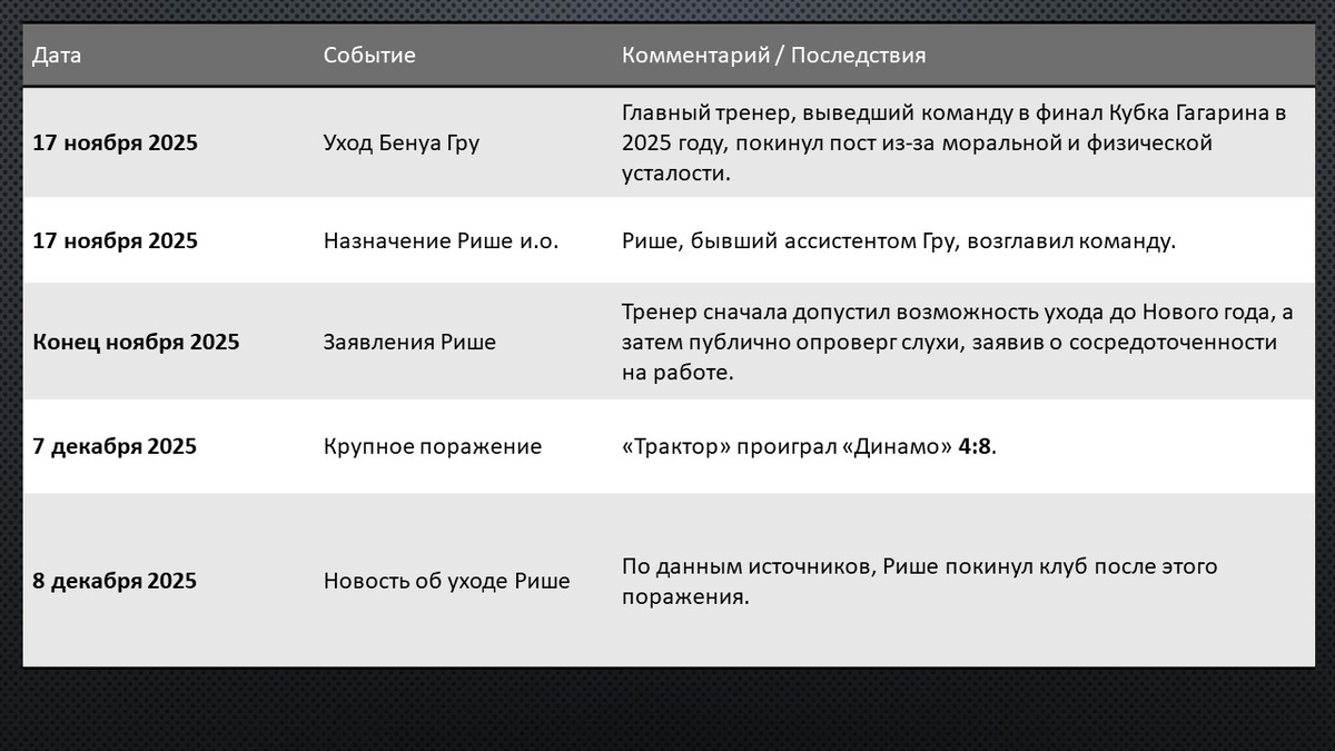 Согласно сообщениям информационного агентства URA.RU, челябинский «Трактор» и исполняющий обязанности главного тренера Рафаэль Рише приняли решение о расставании. Источники агентства утверждают, что Рише уже попрощался с игроками, а ключевой причиной стал разгромное поражение от московского «Динамо» со счетом 4:8. Новость выглядит неожиданной, так как сам Рише всего неделю назад опровергал слухи о возможном уходе, заявляя, что останется на посту как минимум до декабрьского перерыва в чемпионате и полностью сконцентрирован на работе с командой. 📅 Хронология тренерского кризиса в «Тракторе» Нынешняя ситуация стала продолжением тренерского кризиса, который начался в ноябре. Ключевые события развивались так: 🧭 Кто возглавит «Трактор»? По данным «Спорт-Экспресса», следующим наставником челябинской команды с высокой вероятностью станет русскоязычный специалист. Конкретные кандидатуры в источниках не называются, что оставляет пространство для предположений: новый тренер может быть как из н