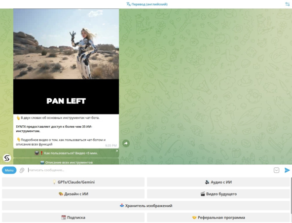 В этой статье я собрал полезные и продвинутые боты для работы с этой нейросетью (и не только). Боты представлены только на русском языке. ТОП ботов ChatGPT в телеграм Телеграм-бот SYNTX Ссылка на телеграм: SYNTX Я поставил этого бота на первое место, так как это наиболее продвинутый и "нафаршированный" бот в Телеграме на сегодняшний день. Мне проще описать, чего в нем нет, чем что в нем есть. В боте есть все популярные современные генеративные модели - ChatGPT, Claude, Gemini (при этом в боте можно выбрать любые как самые современные и навороченные версии моделей, так и более старшие). Генерировать в боте можно как видео с помощью RunWay, Kling и LUMA, так и аудио (с помощью SUNO и синтез речи), так и изображения с помощью Midjourney, DALL-E, Ideogram, Flux, SD. Кроме этого, есть редактор изображений с функцией замены лиц и многое другое. После регистрации в боте даются бесплатные токены, чтобы можно было изучить функционал бота. 2. Бот Бесплатный ChatGPT o1 4o Ссылка в телеграм: Бес