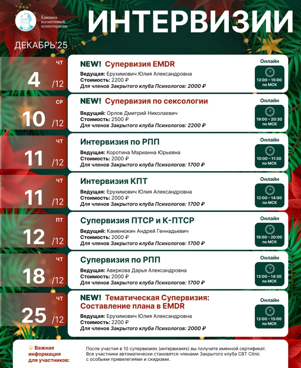 🎓 Коллеги, напоминаем, что на этой неделе состоятся групповые встречи для специалистов: ⚡️NEW! Онлайн Супервизия по сексологии Ведущий: Орлов Дмитрий Николаевич Дата и время: 10 декабря (чт), 19:00 – 20:30 по МСК Формат: Онлайн Стоимость: 2500 руб. (2200 руб. для членов Закрытого клуба Психологов) Кейс свободен 🎥 Онлайн Интервизия по РПП Ведущая: Коротина Марианна Юрьевна Дата и время: 11 декабря (чт), 10:00 – 11:30 по МСК, Формат: Онлайн Стоимость: 2000 руб. (1700 руб. для членов Закрытого клуба Психологов) Кейс забронирован 🎥 Онлайн Интервизия КПТ Ведущая: Ерухимович Юлия Александровна Дата и время: 11 декабря (чт), 12:00 – 14:00 по МСК Формат: Онлайн Стоимость: 2000 руб. (1700 руб. для членов Закрытого клуба Психологов) Кейс свободен 🎥 Онлайн Супервизия ПТСР и К-ПТСР Ведущий: Каменюкин Андрей Геннадьевич Дата и время: 12 декабря (пт), 18:00 – 20:00 по МСК Формат: Онлайн Стоимость: 2000 руб. (1700 руб. для членов Закрытого клуба Психологов) Кейс забронирован 👉 Оставить заяв