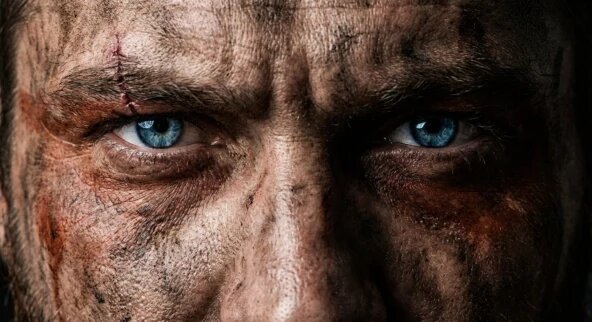 Промпт: Extreme close-up of fierce warrior eyes, intense piercing blue irises, battle-hardened expression, scar near left eyebrow, dirt and war paint on face, dramatic side lighting creating deep shadows, photorealistic, high contrast, determination visible in gaze, 4K detail