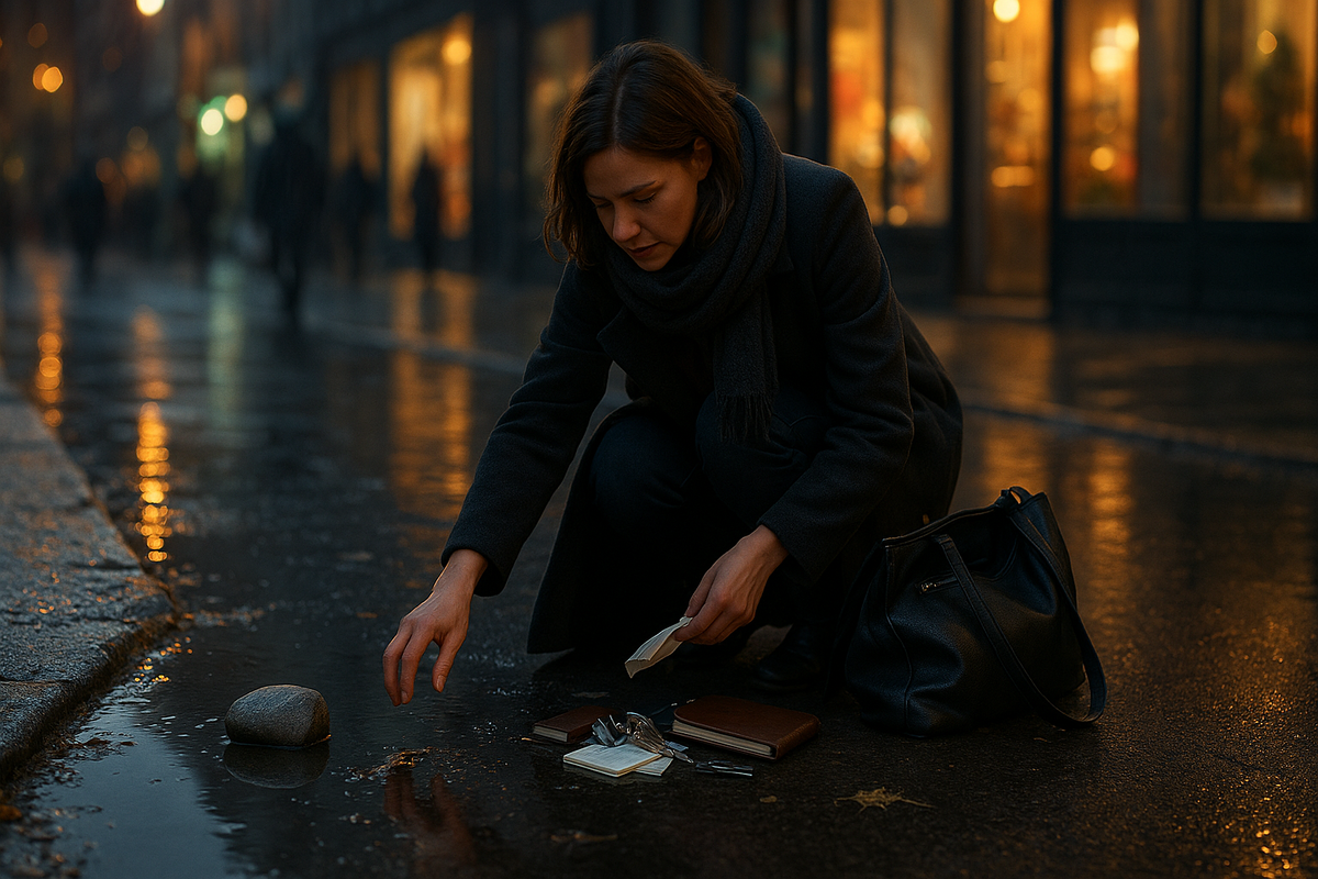 На повороте у магазина она зацепилась ремнём сумки за торчащий кусок металлической ограды. Всё произошло мгновенно: рывок, резкий хлопок, ремень порвался, молния раскрылась, содержимое сумки посыпалось на влажный асфальт.