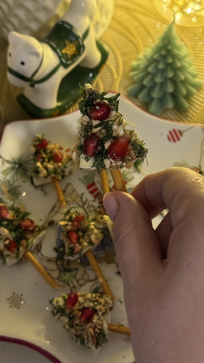 Эта яркая и простая закуска идеально подойдёт для новогоднего стола: выглядит эффектно, готовится быстро и отлично сочетается с игристым вином. Ингредиенты (количество — по вкусу и в зависимости от числа гостей): • сыр Бри (круглый) • укроп свежий • зерна граната • орехи: грецкий / кешью / миндаль • солёные палочки (соломка) • мёд Пошаговый рецепт 1. Подготовьте зелень и гранат – Укроп вымойте, обсушите и мелко измельчите. – Гранат очистите, достаньте зерна. 2. Измельчите орехи – Орехи (любые из перечисленных или смесь) слегка перебейте в блендере до крошки, не в пасту. – Можно порубить ножом, если нет блендера. 3. Сделайте «панировку» для ёлочек – В миске смешайте: укроп + крошку орехов + зерна граната. – Это будет яркая ароматная смесь, в которую вы будете обмакивать сыр. 4. Нарежьте сыр Бри – Круг сыра разрежьте пополам. – Каждую половину нарежьте на треугольники — получится форма маленьких ёлочек. 5. Подготовьте «стволы» – Солёные палочки разломайте