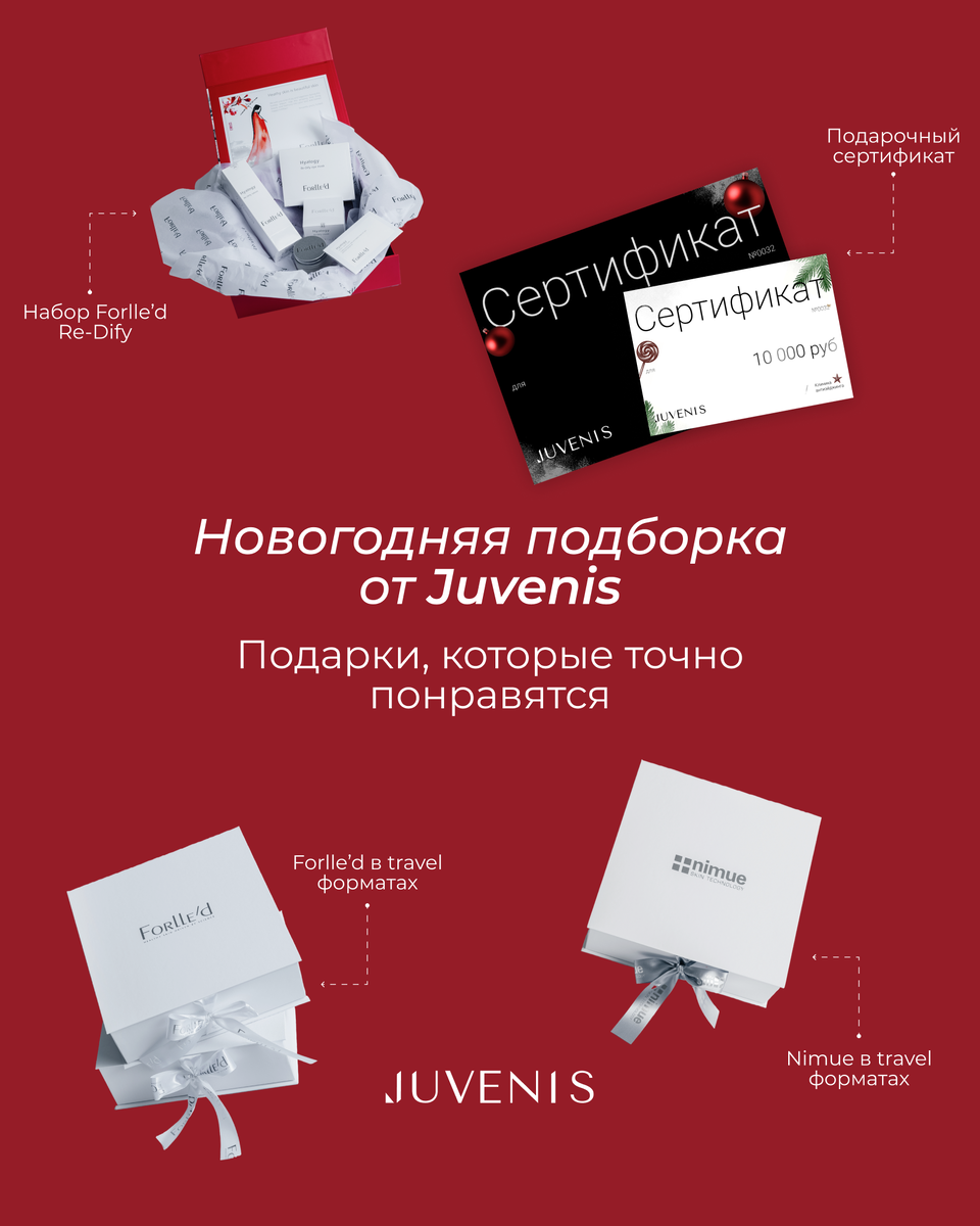 Декабрь — время тепла, света и заботы. Мы собрали идеи подарков, которые подойдут тем, кто ценит качество, внимание к деталям и уход за собой. Всё можно приобрести в клинике Juvenis или оформить в подарок близким. Подарочный сертификат Juvenis Универсальный подарок, который подходит всем. В декабре доступны сертификаты нескольких праздничных оформлениях — можно выбрать стиль, который ближе по духу. Номиналы — от 10 000 до 100 000 ₽. При покупке от 50 000 ₽ — +10% на счёт пациента. Сертификат можно использовать на: — уходовые процедуры, — инъекционные и аппаратные программы, — консультации специалистов, — косметику премиальных брендов. Подарок, который действительно позволяет выбрать то, что нужно именно сейчас. Набор Forlle’d Re-Dify Премиальный уход для плотности, упругости и восстановления кожи. Внутри: Re-Dify Lotion 120 мл Re-Dify Cream 50 мл Re-Dify Eye Mask — 8 пар Подарочный семпл гиалуроновой сыворотки и кремов Свеча с новогодними пожеланиями Идеальный вариант для тех, к