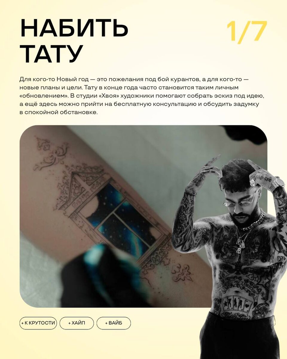 Прихорашиваемся к Новому году: как с кайфом войти в конец декабря 💅🏻 Мы предлагаем не тянуть до 31-го декабря, а начать подготовку к празднику заранее — спокойно и с любовью к себе. Мы подготовили для вас чек-лист дел, которые реально помогают начать праздновать не уставшими, а собранными, красивыми и довольными собой 🥰 Для удобства собрали для вас все проекты, где можно прихорошиться к Новому году: Тату-студия «Хвоя» Спа-дом «Светлый» Глэмпинг «Отражение» Салон красоты «Луч» Студия массажа ONI Магазин косметики Keauty Фитнес-клуб THE FLEX #гид_новыйгод Реклама