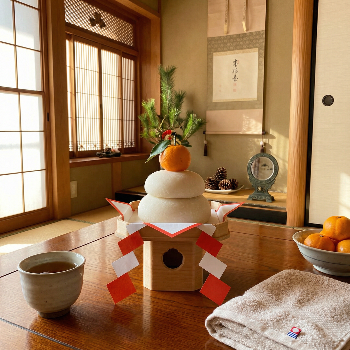 Декабрь — удивительное время. С одной стороны, это суета, горящие дедлайны и бесконечный поиск подарков. С другой — в воздухе уже разлито едва уловимое волшебство, пахнет мандаринами и хвоей, а сердце замирает в предвкушении чуда. До главной ночи года остался всего месяц. Это идеальное время, чтобы не окунаться в хаос с головой, а наоборот — замедлиться и начать наполнять дни маленькими ритуалами, создающими то самое новогоднее настроение. Чтобы вдохновить вас, мы решили заглянуть в Японию и поделиться одной очень красивой и мудрой легендой, которая согревает не хуже чашки горячего какао. Зеркало для Богини Солнца Если вы окажетесь в Японии в канун Нового года, то повсюду увидите странную, но очень симпатичную конструкцию: две круглые белые лепешки из клейкого риса, сложенные одна на другую, а сверху — маленький оранжевый цитрус, похожий на мандарин. Это 鏡餅 (Кагами Моти), что дословно переводится как «зеркальные рисовые лепешки». Почему зеркальные? За этим названием скрывается одна