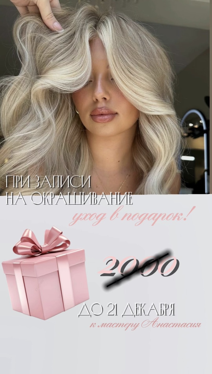 При окрашивании уход в подарок! Хотите обновить цвет волос и получить ухоженный, сияющий результат без переплат? Парикмахер Анастасия специализируется на исправлении сложных случаев окрашивания, выходу из черного и владеет всеми трендовыми техниками сложного окрашивания. Владеет формулами чистых оттенков блонда и знает, как сделать мягкие переходы. Сейчас действует акция: «При любом окрашивании уход для волос В ПОДАРОК!» Это не мини-процедура, а полноценный профессиональный уход стоимостью от 2000 рублей. Он включен бесплатно при записи на: – однотонное окрашивание – сложные техники: air touch, шатуш, балаяж, омбре, highlights, babylights Уход направлен на питание, восстановление и защиту волос, чтобы после окрашивания они оставались блестящими и мягкими. Акция действует до 21.12.25. ✅Онлайн-Запись на сайте 24/7: beautyblik.ru ⠀ Контакты: 8 950 922 38 77 ⠀ 📍Тула, Советская 7, ТЦ «Михайловский», оф 104
