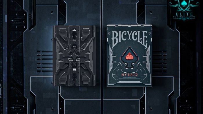 Карты Bicycle Hybrid - королевства нового мира. Дизайн карт - темные металлический фон, с цветами напоминающими подсветку космических кораблей. Идея создания карт принадлежит компании Elite Playing Cards (создатели карт Bicycle Gold, Bicycle Excellence и других премиальных карт) и заключается в борьбе добра со злом в пост-апокалиптическом мире. На официальном сайте указано что карты будут передавать кибернетическую атмосферу с оттенком ретро-видеоигры. Хотя у меня не проходит ощущение, что это скорее оттенок видеомагнитофона из 90-х. Выпуск карт был в сентябре 2018 г. Всего будет напечатано 5000 колод и 750 специальных ограниченных колод, которые будут иметь позолоченные кромки и пронумерованы. Производителем будет компания USPCC исключительно в Q1 Quality