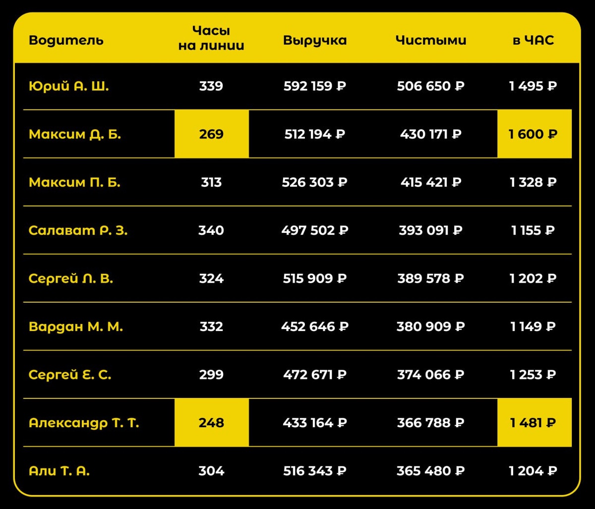 💪 ТОПЫ ПО ПРИБЫЛИ ЗА НОЯБРЬ Выручка — общий накат "грязными" "Чистыми" — вычитая комиссию Яндекса, комиссию парка не вычитал специально, чтобы все могли сравнить себя, ну и не забывайте, что машины у всех разные В час — это условная "чистая" прибыль из таблицы делённая на количество часов на линии ✅ Я считаю, что главный рейтинг это доход в час при накате 250+. Так как это именно эффективность, умение зарабатывать хорошие деньги, работая как нормальный человек. ТОП 3 по по доходу в час: 🥇 Максим Д.Б. — 1 600 ₽ / час, 269 часов на линии (при графике 6/1 будет по 10 ч. 45 мин. в день) 🥈 Юрий А.Ш. — 1 495 ₽ / час, 339 часов на линии (при графике 6/1 будет по 13,5 часов в день) 🥉 Александр Т.Т. — 1 481 ₽ / час, 248 часов на линии (при графике 6/1 будет по 10 часов в день) ТОП 3 по "чистой" прибыли: 🥇 Юрий А.Ш. — 506 650 ₽ 🥈 Максим Д.Б. — 430 171 ₽ 🥉 Максим П.Б. — 415 421 ₽ ☝️ Все водители из топов работают на К+, что не удивительно, так как там стоимость заказа выше, соответс