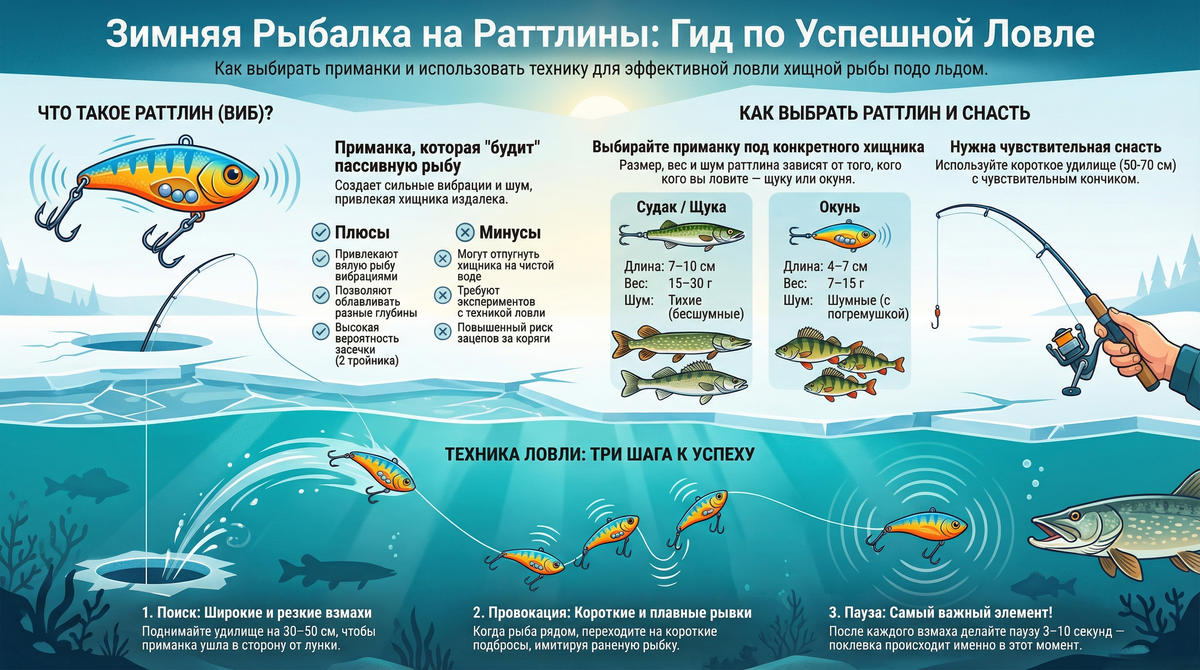 ⚙️ Устройство и типы раттлинов Раттлин — это тяжелая приманка из пластика или композита с креплением на спине и двумя тройниками (на хвосте и брюшке). Отличительная черта большинства моделей — встроенная шумовая система (погремушка) с металлическими шариками для привлечения рыбы с большого расстояния. ❄️ Отличие зимних моделей: Зимние раттлины имеют особую геометрию (часто ромбовидную или удлиненную с изгибами), которая позволяет им уходить в сторону от лунки во время проводки, имитируя раненую или убегающую рыбку. Летние модели часто движутся только вертикально, что менее эффективно для подледной ловли. 📋 Типы по характеристикам: По плавучести: