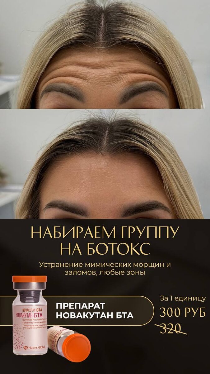 🔔 Собираем группу на процедуру ботокса Novacutan БТА! Уникальная возможность: Всего 300 руб. за единицу вместо 320 руб.! 🌟 ✨ Преимущества Novacutan БТА: - Эффективное устранение мимических морщин - Длительный эффект - Безопасность и комфорт процедуры 📅 Запись ограничена, не упустите шанс! Присоединяйтесь к группе уже сегодня и откройте новые горизонты красоты. Будем рады видеть вас в нашей группе на процедуру ботокса! 💖
