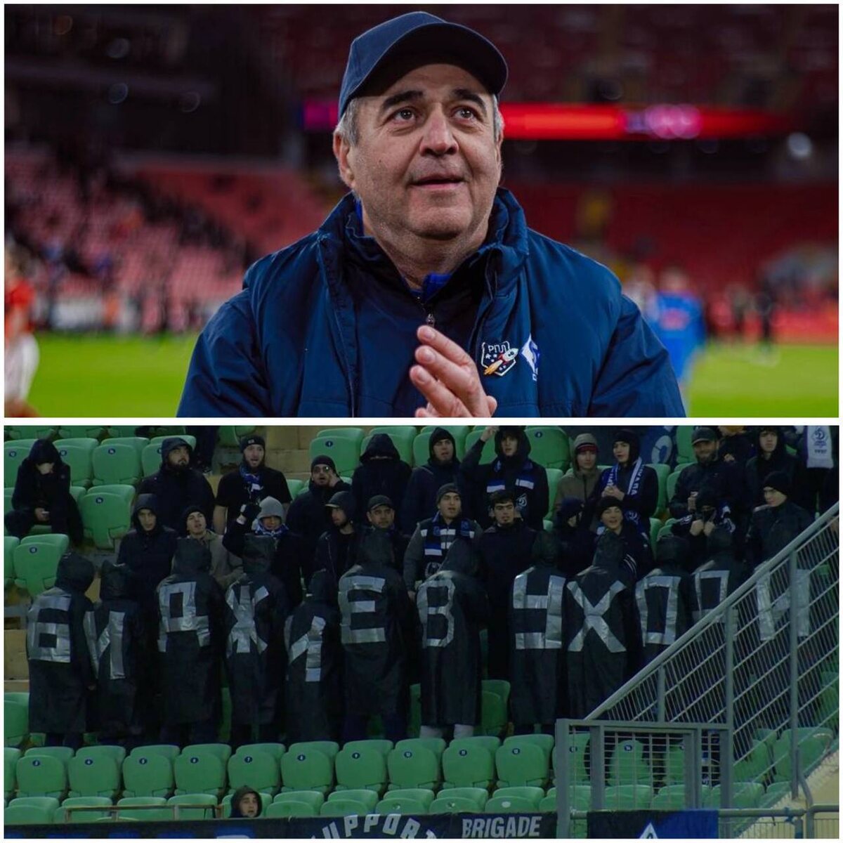 Дам небольшую справку. На домашних матчах «Динамо» есть два фан-сектора, каждый из которых находится за воротами. Первый, за левыми по телекартинке воротами, закреплён за «Каспийской Флотилией» — фанатским движением, созданным при поддержке клуба. Противоположный сектор занимает фанатское движение «Старая Гвардия»; они и были организаторами этого перфоманса. Вечером после игры фанатскую акцию прокомментировал сам Биджиев в интервью «Матч ТВ»: