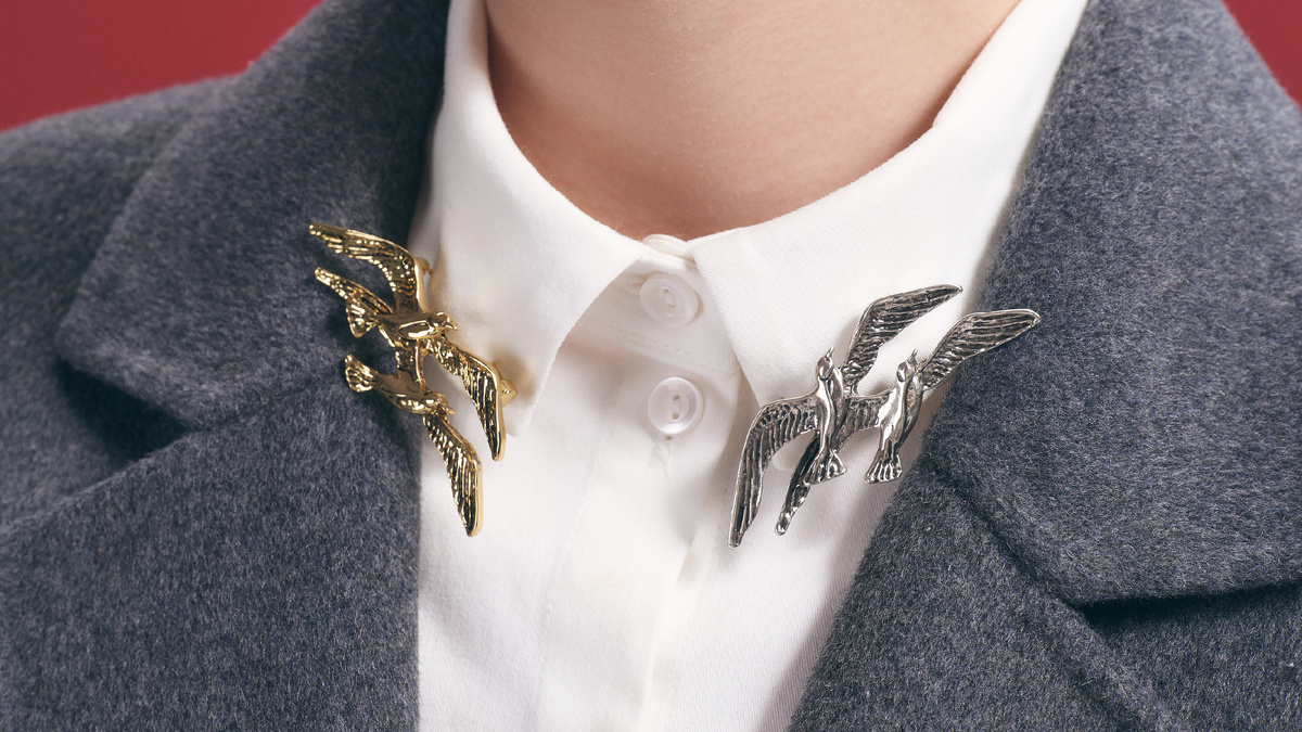 Зимой брошь — это не просто украшение, а рабочий инструмент стиля. Она собирает ткани, подчёркивает линию плеча, добавляет акцент там, где не хватает фактуры. И самое главное — работает с тёплой одеждой лучше, чем любое другое украшение. Мы собрали 7 проверенных зимних приёмов, основанных на стилизации коллекции «Сирин». 1. Закрепить шарф или палантин Тёплый палантин всегда живёт своей жизнью: сползает, перекручивается, теряет форму. Брошь решает всё за секунду — фиксирует ткань красиво, подчёркивая драпировку. Зимой этот приём буквально спасает образ: не нужно поправлять шарф каждые 5 минут. 2. Создать эффект cross-body Тренд, который в 2025 становится особенно заметным. Несколько брошей, расположенных диагонально по корпусу, формируют стильную линию — будто декоративную лямку сумки. Такой приём работает и на пальто, и на платьях, и на плотных свитерах. Мощный акцент без лишнего веса. 3. Стилизовать головной убор Береты, шляпы, мягкие шерстяные пилотки — всё это идеальная база для