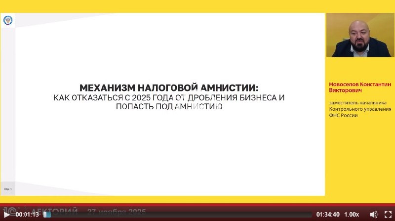 ‼️ Про механизм налоговой амнистии: как отказаться с 2025 года от дробления бизнеса и попасть под амнистию рассказал Константин Новоселов, заместитель начальника Контрольного управления ФНС России, д.э.н., профессор кафедры налогов и налогового администрирования Финансового университета при Правительстве РФ, в лекции на тему: Дробление бизнеса: порядок применения налоговой амнистии Отзыв слушателя: Очень понравилось, Лектор МОЛОДЕЦ!!! Всё понятно. Всё ясно, Всё просто 👉 Смотрите бесплатно полную видеозапись лекции *️⃣ Дополнительные материалы налоговой амнистии при дроблении бизнеса смотрите на сайте ФНС 🚨Подписывайтесь на @lector_1c