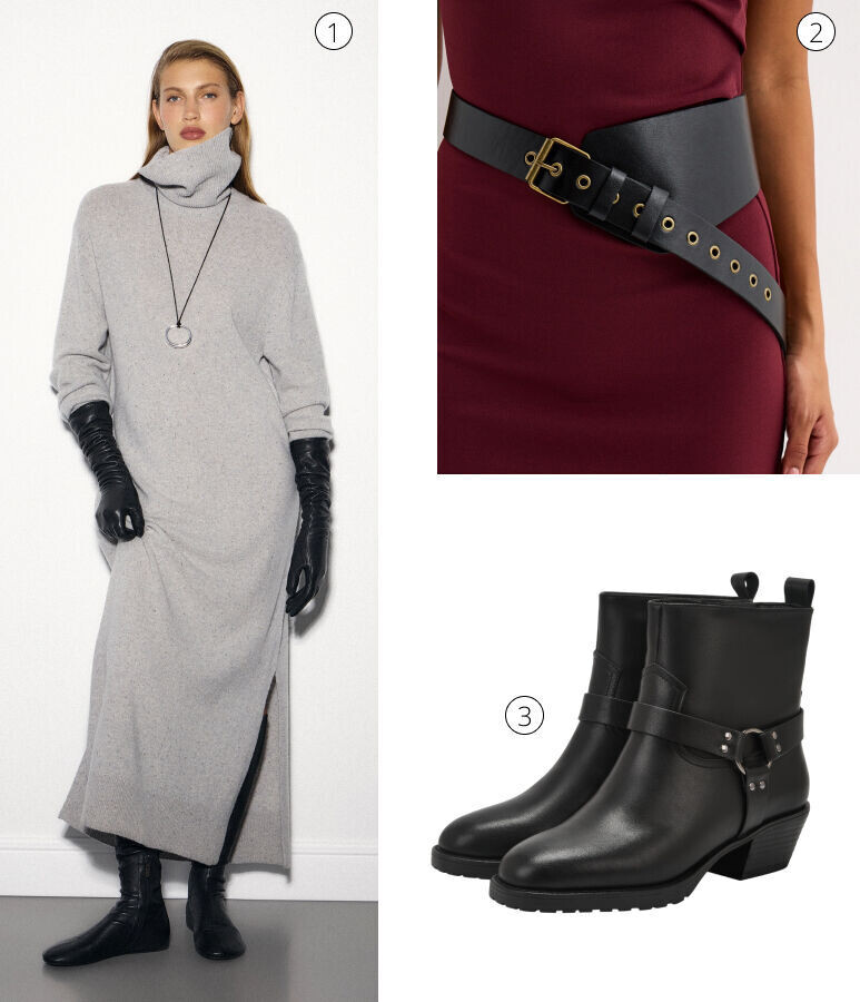 Девушка, которая смотрит эту подборку, с пользой проведет следующие три минуты и в награду получит готовый список новых классных идей для своих аутфитов. Да, ты — та самая! Что надеть? Эта доска знает ответ! Баннер-4.jpg (101.06 KB) Один из любимых образов для офиса, который выручает меня при отсутствии фантазии с утра, — трикотажное платье свободного кроя и кожаная баска вместо ремня или шнурка. Такой аутфит и после работы уместен — на свидание или какое-нибудь праздничное мероприятие. Останется только добавить обувь на небольшом каблуке. Готовый образ: 1. Трикотажное платье IDOL, 16 990 руб. 2. Кожаная баска Ruxara, 5 600 руб. 3. Зимние казаки Thomas Munz, 5 519 руб. Основа — кожаная мини-юбка и свитер-паутинка. Далее расставляем акценты: заправляем кофту под ремень, вытягиваем силуэт плотными колготками в тон и ботинками с металлическим декором. Добавляем золотые украшения и готовимся получать комплименты (и не только от спутника). Готовый образ: 1. Кожаная мини-юбка BORN2WEAR, 2